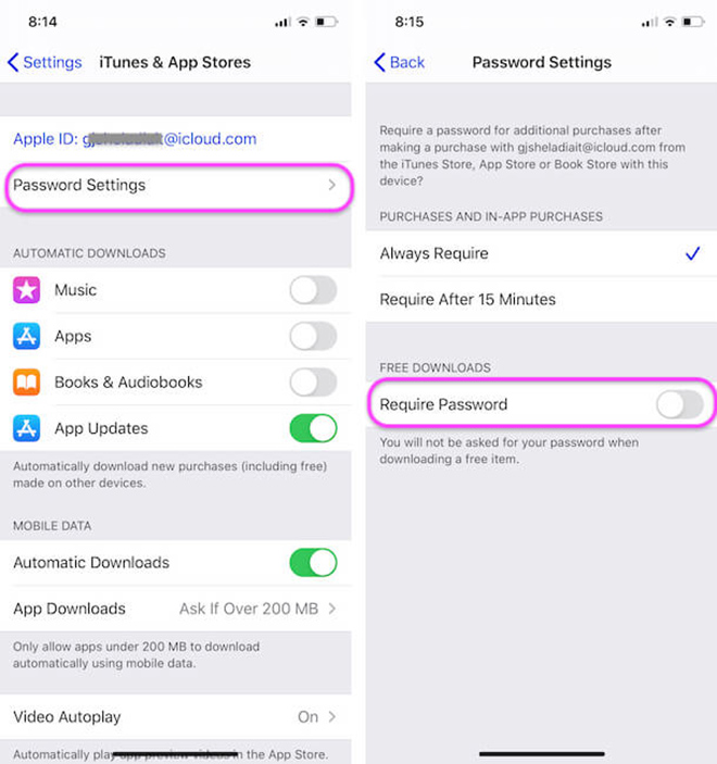 Nếu người dùng không muốn vô hiệu hóa hoàn toàn mật khẩu để tải xuống các ứng dụng miễn phí, họ có thể chọn giữa Luôn yêu cầu (Always Require) và Yêu cầu sau 15 phút (Require After 15 Minutes). Về cơ bản, khi chọn Luôn yêu cầu sẽ buộc người dùng nhập mật khẩu cho mỗi lần mua và nếu chọn Yêu cầu sau 15 phút, người dùng không phải nhập mật khẩu trong vòng 15 phút sau khi tải xuống ứng dụng đầu tiên. Và để tắt hoàn toàn yêu cầu mật khẩu tải xuống ứng dụng miễn phí trên iPhone, đây là cách thực hiện.