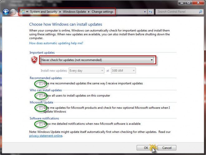 Automatic Updates: Để tắt chương trình này, vào Control Panel, chọn: Windows Update/Change Settings/Never check for updates/OK. Chú ý rằng điều này có thể làm hệ thống không được bảo vệ nếu bạn không tự cập nhật một cách thường xuyên.