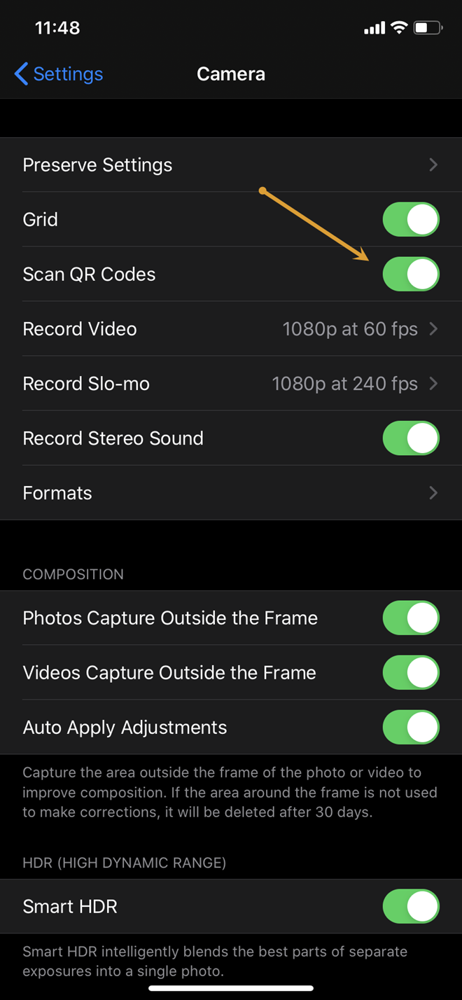 • Tiếp theo hãy bật tùy chọn Scan QR Codes (Quét mã QR) để kích hoạt tính năng.