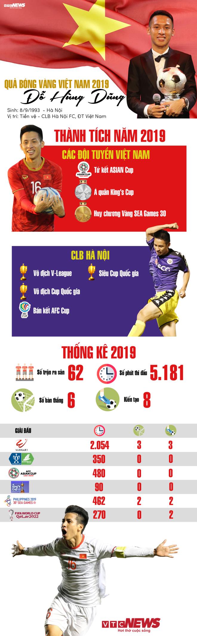 Tiền vệ Đỗ Hùng Dũng vừa giành danh hiệu Quả bóng Vàng Việt Nam 2019 sau một năm thi đấu xuất sắc cho các ĐT Việt Nam lẫn CLB.
