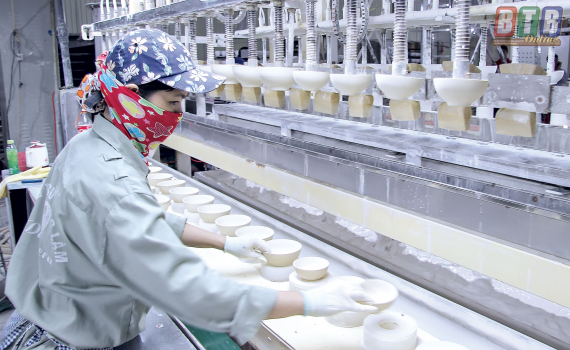 Công nhân Công ty TNHH Sứ Đông Lâm (khu công nghiệp Tiền Hải) thi đua lao động sản xuất.