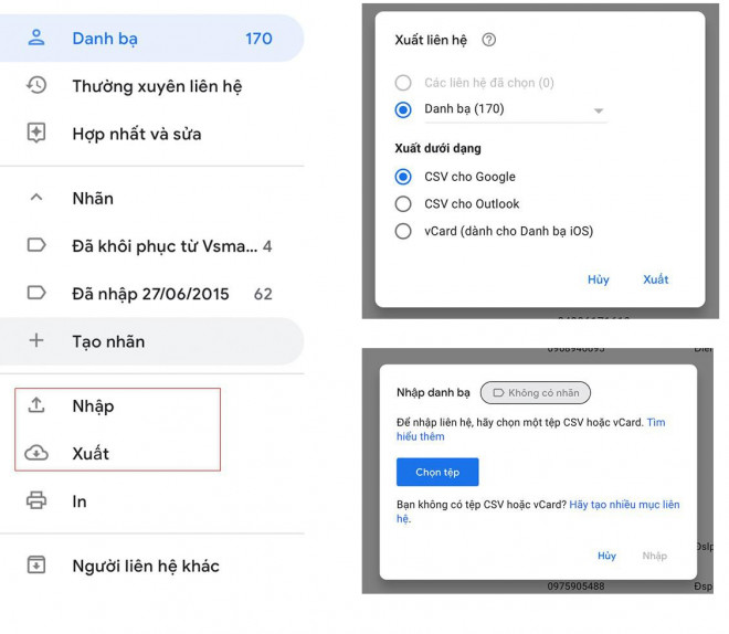 Để tránh bị mất các số điện thoại mới thêm vào, bạn nên sao lưu lại toàn bộ danh bạ trước khi thực hiện việc khôi phục bằng cách bấm vào tùy chọn Xuất trong thanh menu bên trái, sau đó lựa chọn nơi lưu trữ.