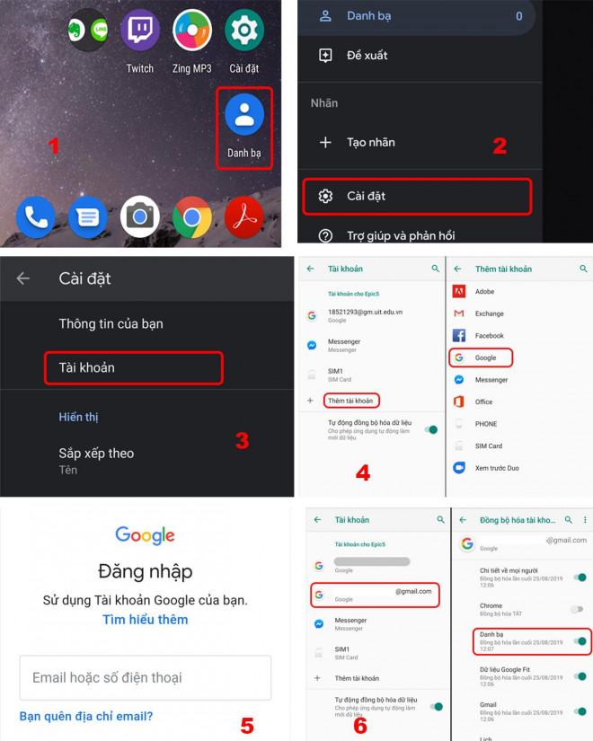 Vào Cài đặt trên Android, chọn Cloud và tài khoản. Nhấn chọn tiếp Tài khoản. Chọn tài khoản Google/Gmail đồng bộ danh bạ Android. Nhấp chọn Đồng bộ tài khoản ở màn hình hiển thị, sau đó đồng bộ lại danh bạ là xong.