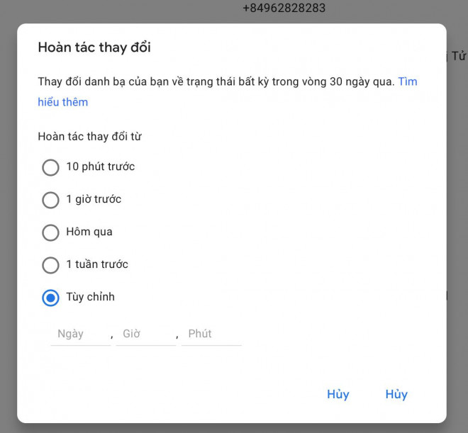 Lúc này sẽ có một cửa sổ nhỏ xuất hiện hỏi bạn muốn khôi phục danh bạ từ thời điểm nào, từ 10 phút trước đến tối đa 30 ngày. Chọn xong bạn nhấp chuột hủy, chờ một lát để quá trình khôi phục và đồng bộ dữ liệu với smartphone hoàn tất.
