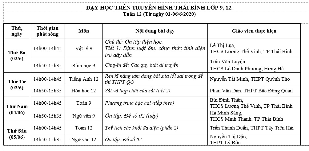 Chương trình dạy học trực tuyến trên truyền hình, tuần 12 (từ 01/6 đến 06/6) dành cho học sinh lớp 9,12.