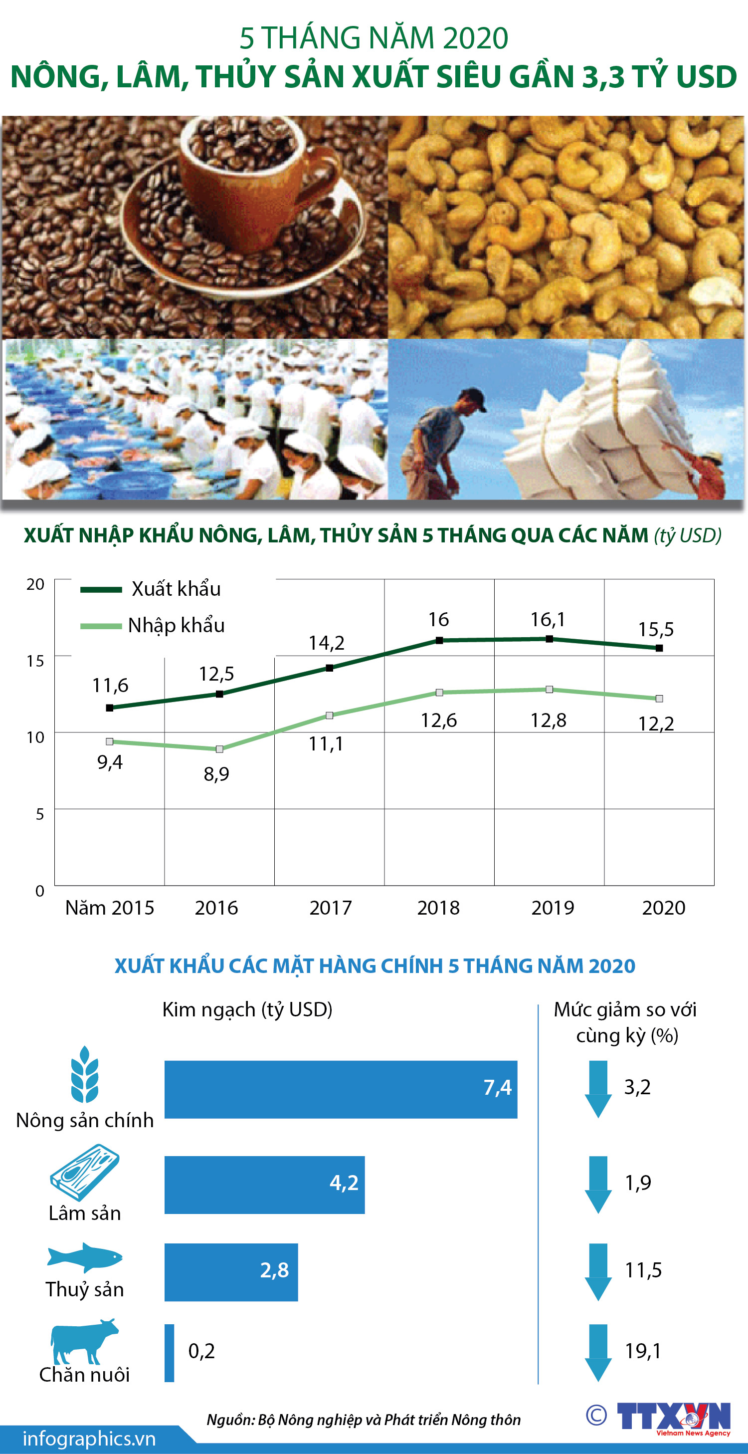 5 tháng năm 2020, tổng kim ngạch xuất nhập khẩu hàng nông, lâm, thủy sản ước đạt gần 27,7 tỷ USD, giá trị xuất siêu gần 3,3 tỷ USD.