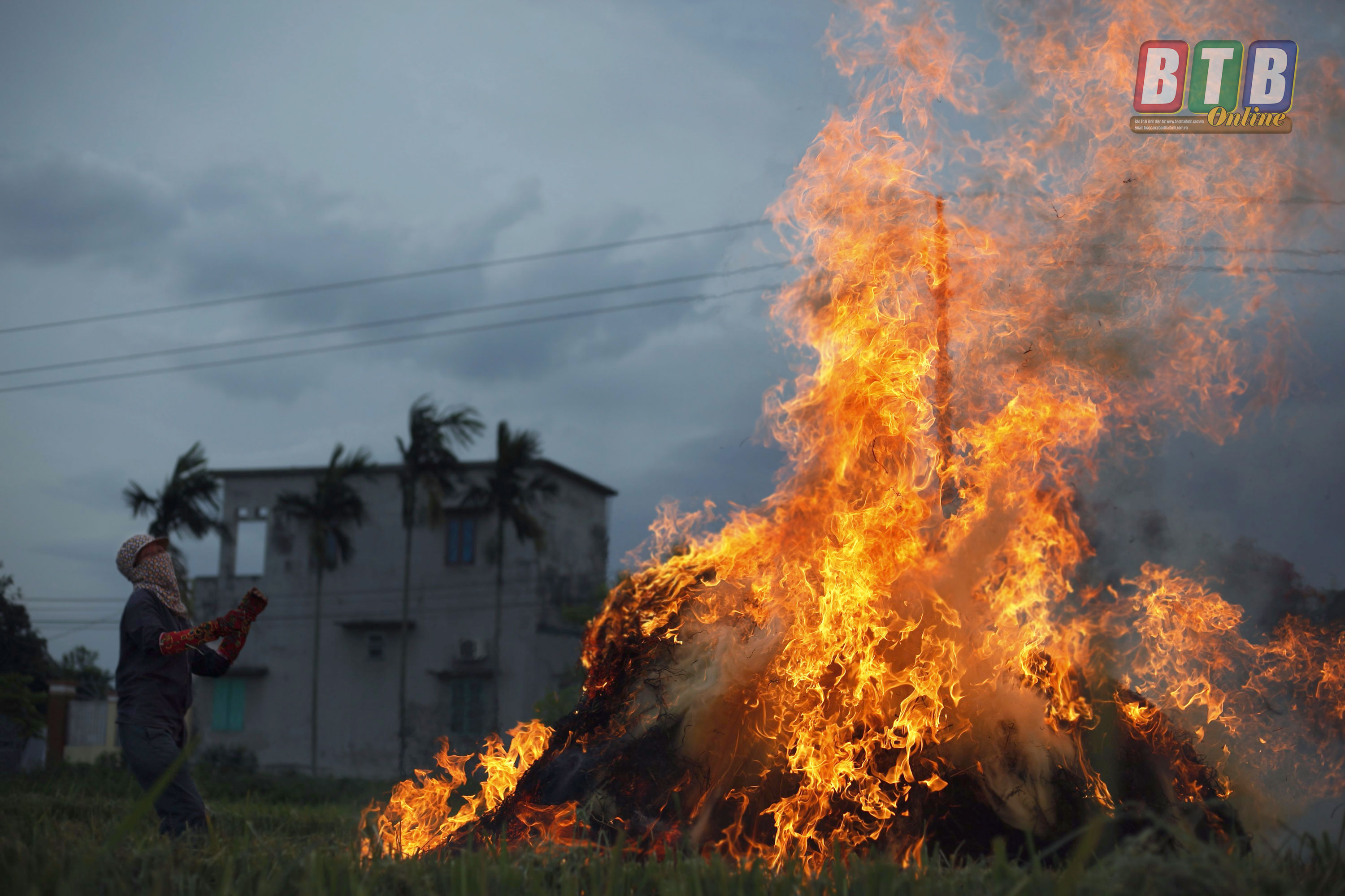 Lửa đốt rơm bùng lên khi chiều xuống trên cánh đồng thôn Bắc Song.
