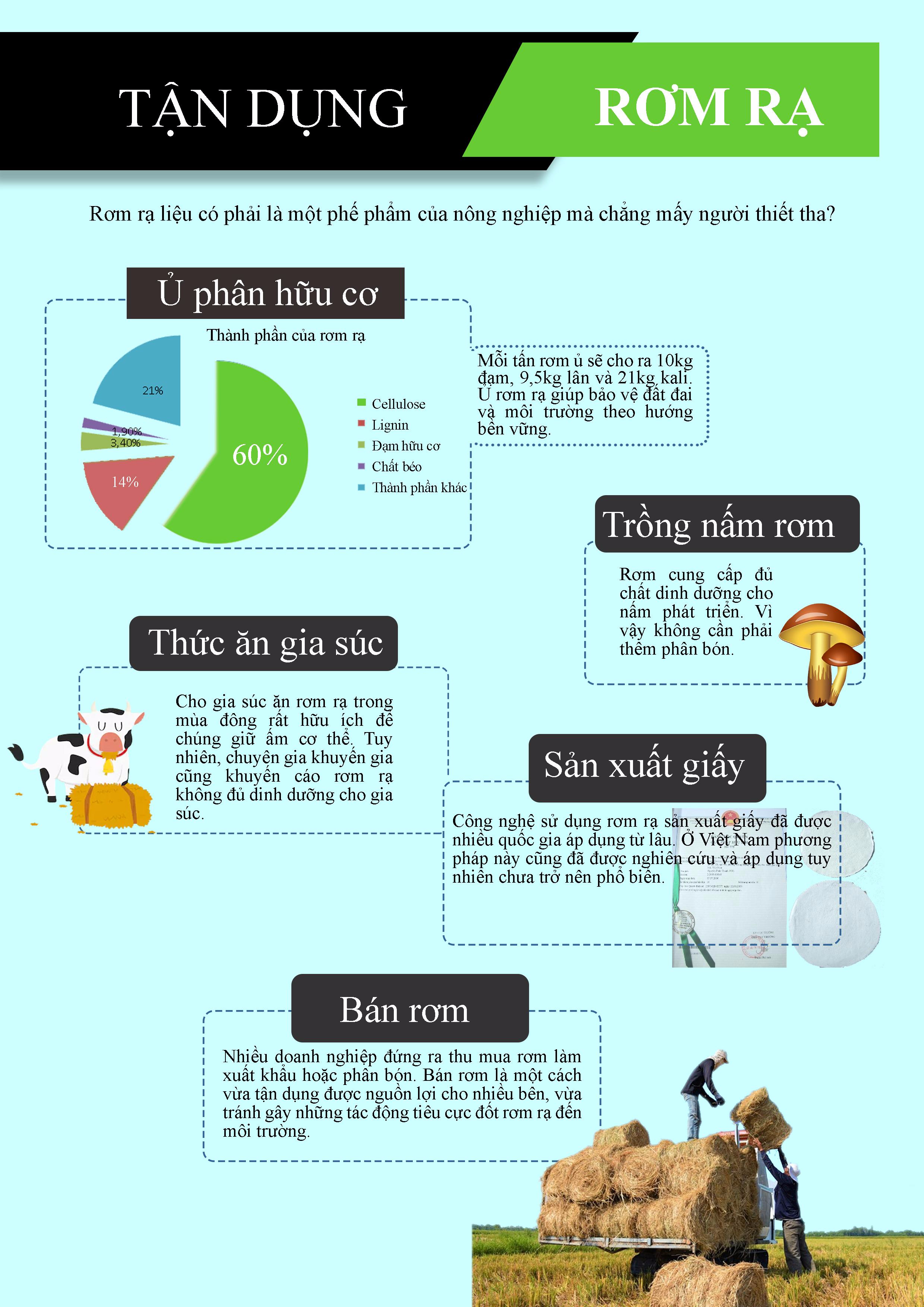 Trước đây rơm rạ được người dân thu về để đun nấu, làm chổi rơm, nón rơm… Thế nhưng cùng với sự phát triển của cuộc sống, hiện nay rơm rạ đã trở thành phế phẩm của nông nghiệp.