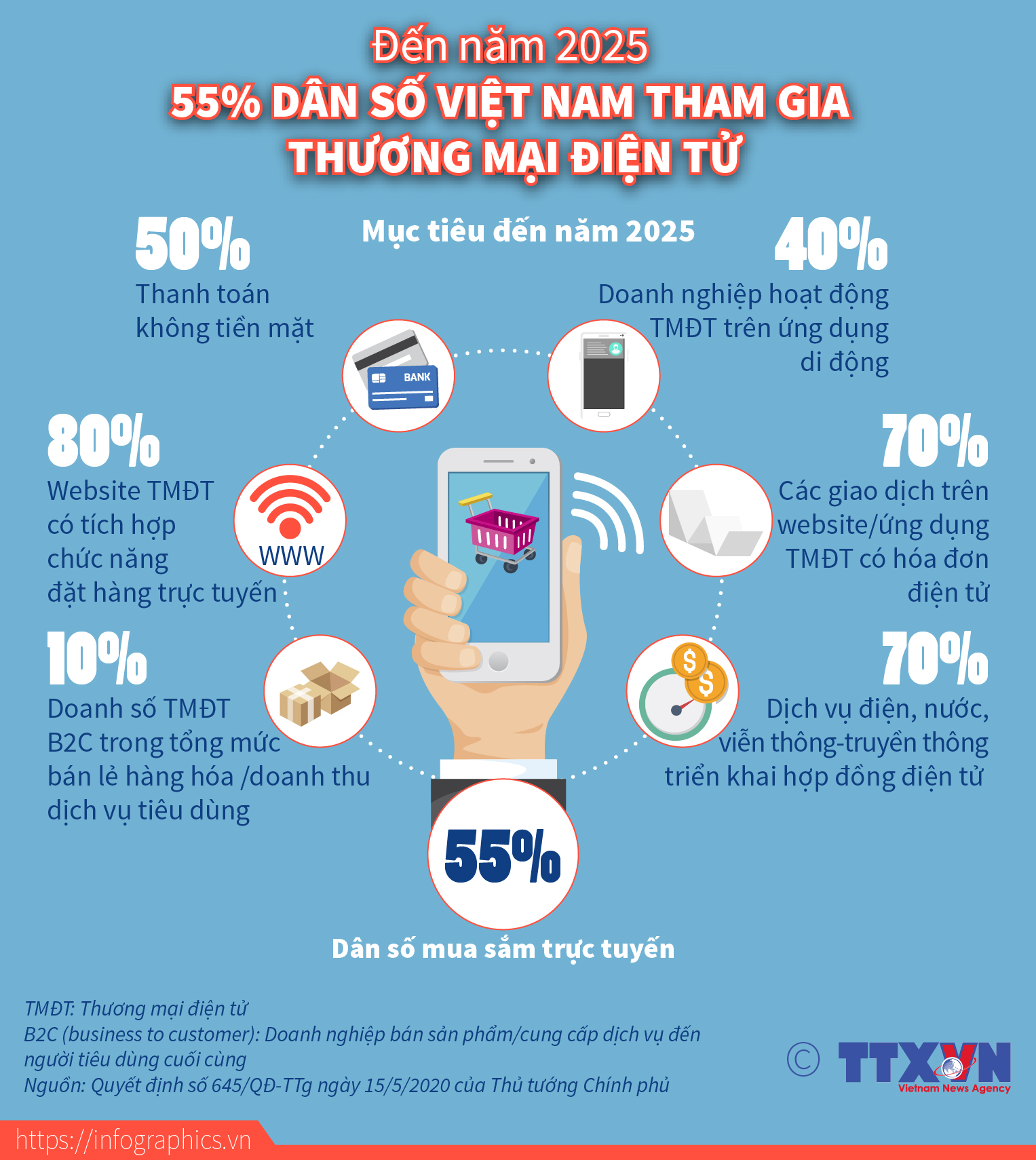 Theo kế hoạch phát triển thương mại điện tử đến năm 2025, Việt Nam sẽ có khoảng 55% dân số mua sắm trực tuyến với giá trị mua hàng bình quân 600 USD/người/năm.