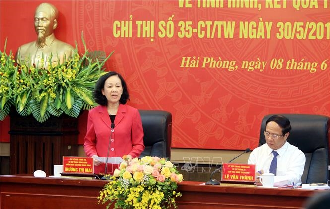 Đồng chí Trương Thị Mai đề nghị cùng với báo cáo về tình hình, kết quả thực hiện Chỉ thị 35-CT/TW của Bộ Chính trị, Hải Phòng cần đánh giá sâu thêm về không khí, quá trình thảo luận văn kiện Đại hội Đảng cấp trên; các khâu đột phá về thể chế, nguồn nhân lực, kết cấu hạ tầng, khoa học công nghệ đổi mới sáng tạo, con người văn hóa cụ thể. Đồng thời, Hải Phòng chọn đột phá nào trên cơ sở phân tích thêm các chỉ tiêu GDP, cơ cấu nông nghiệp, nguồn nhân lực...; công tác xây dựng Đảng khối ngoài công lập trong giai đoạn tiếp theo.