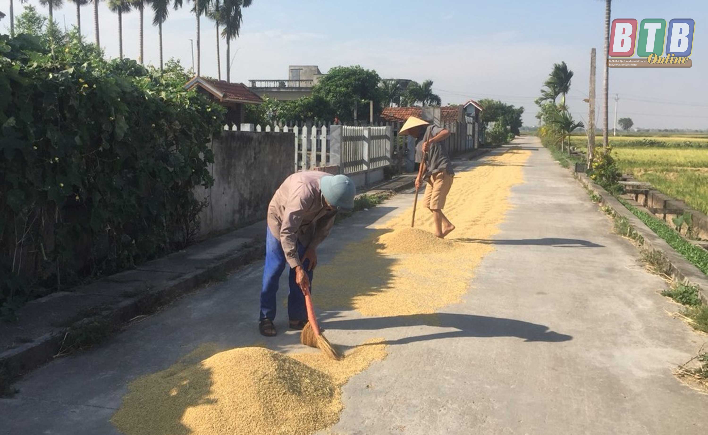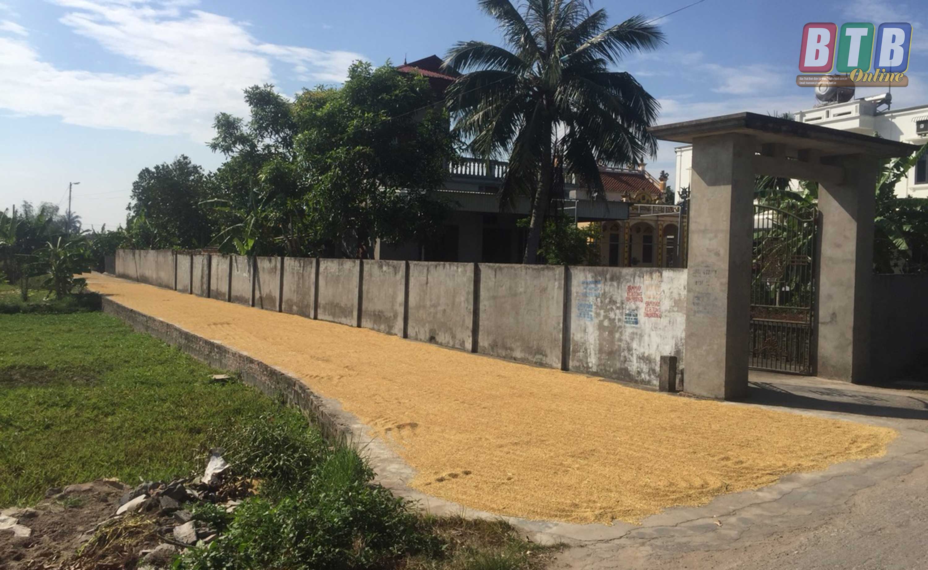 Người dân xã Thanh Tân (Kiến Xương) phơi thóc hết phần mặt đường, gây khó khăn cho người tham gia giao thông.