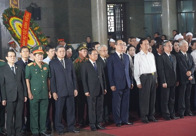 Các đồng chí lãnh đạo Đảng, Nhà nước, Nguyên lãnh đạo Đảng, Nhà nước viếng đồng chí Trần Quốc Hương. (Ảnh: VOV)