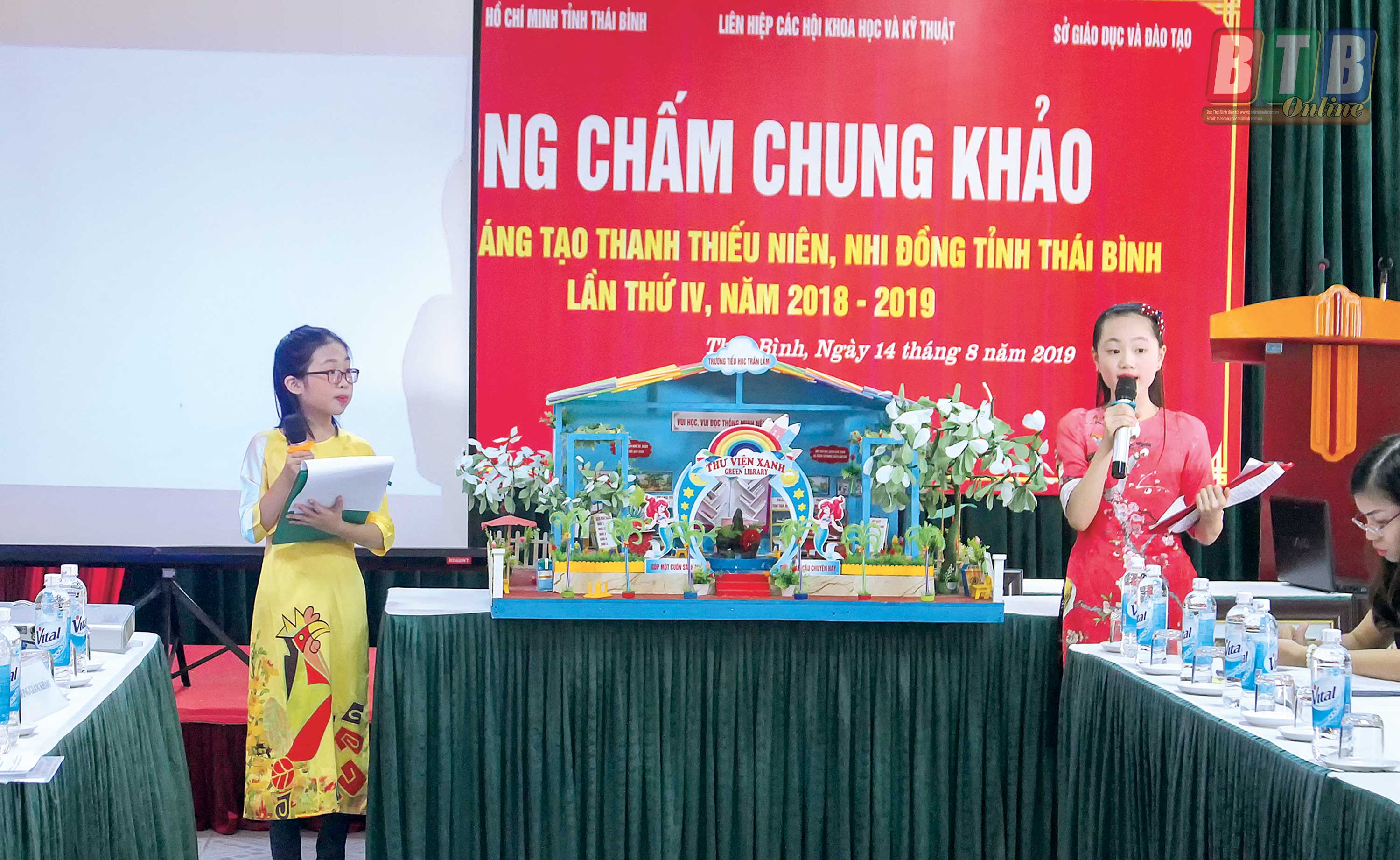 Học sinh Trường Tiểu học Trần Lãm (thành phố Thái Bình) với nghiên cứu mô hình thư viện xanh.