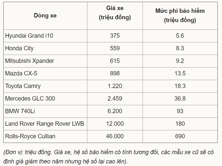 Ví dụ: Một chiếc Vios 2020 thường có hệ số bảo hiểm 1%, giá xe 570 triệu nên mức phí bảo hiểm là 1% x 570 triệu đồng = 5,7 triệu đồng. Tuy nhiên một chiếc Vios 2010 cũng có thể có mức phí khoảng 5-6 triệu đồng, vì xe cũ dễ hỏng, chi phí sửa chữa cao nên hệ số bảo hiểm cao hơn, có thể 1,5-2%.