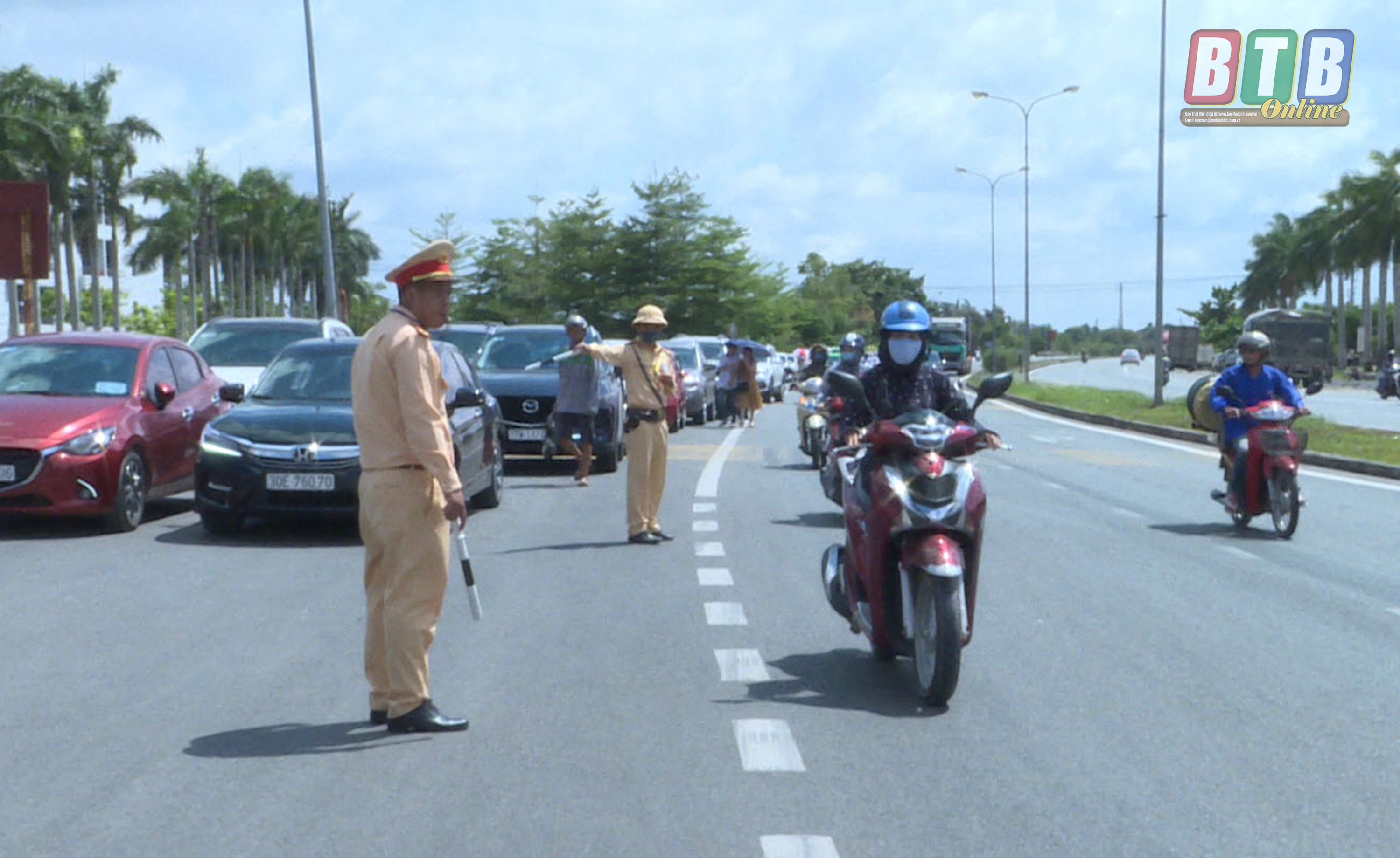 Lực lượng cảnh sát giao thông phân luồng giao thông trước điểm thi Trường Đại học Thái Bình.