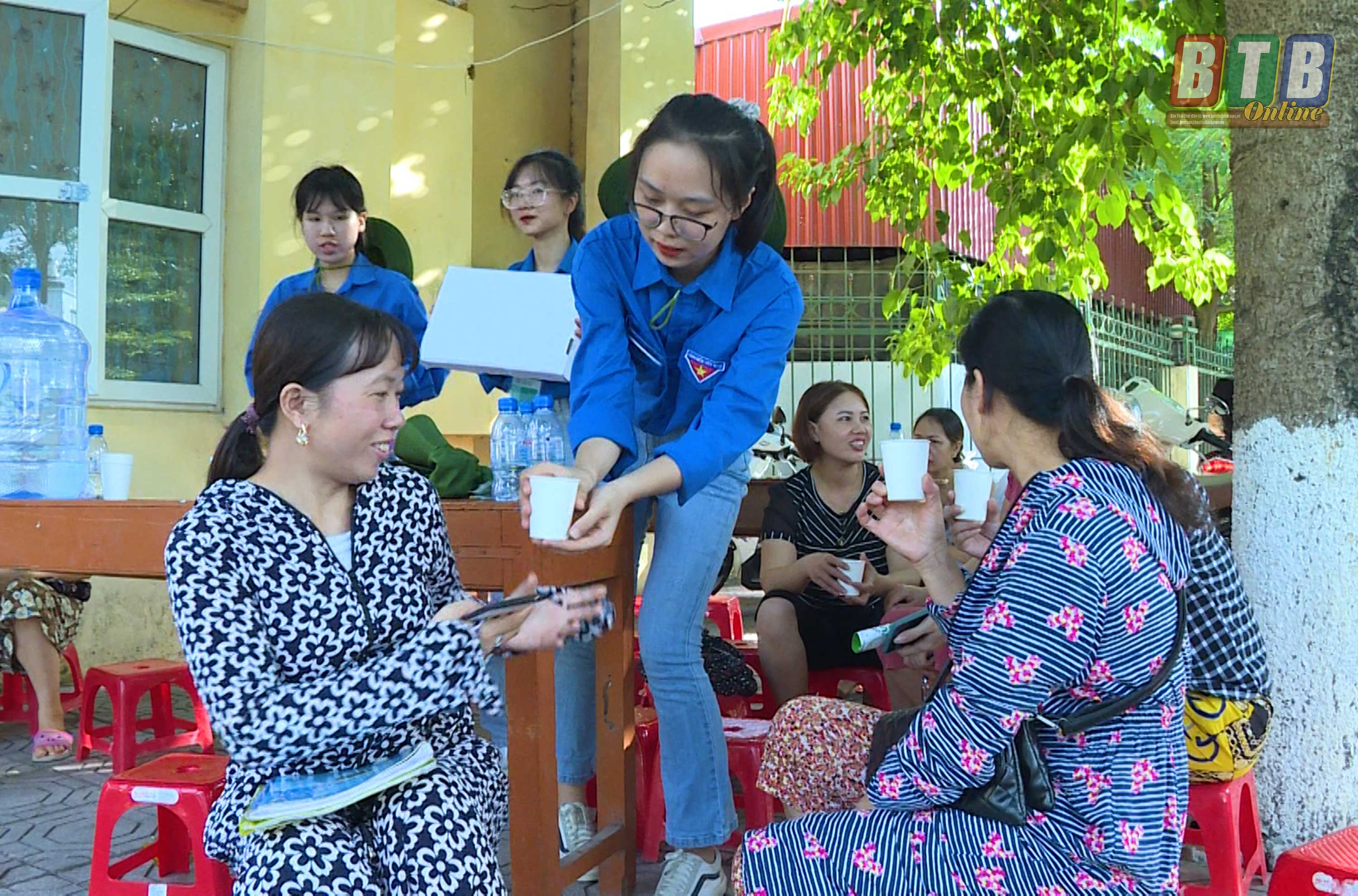 Lực lượng thanh niên tình nguyện tiếp sức mùa thi tại Hội đồng thi Trường THPT Nguyễn Đức Cảnh.