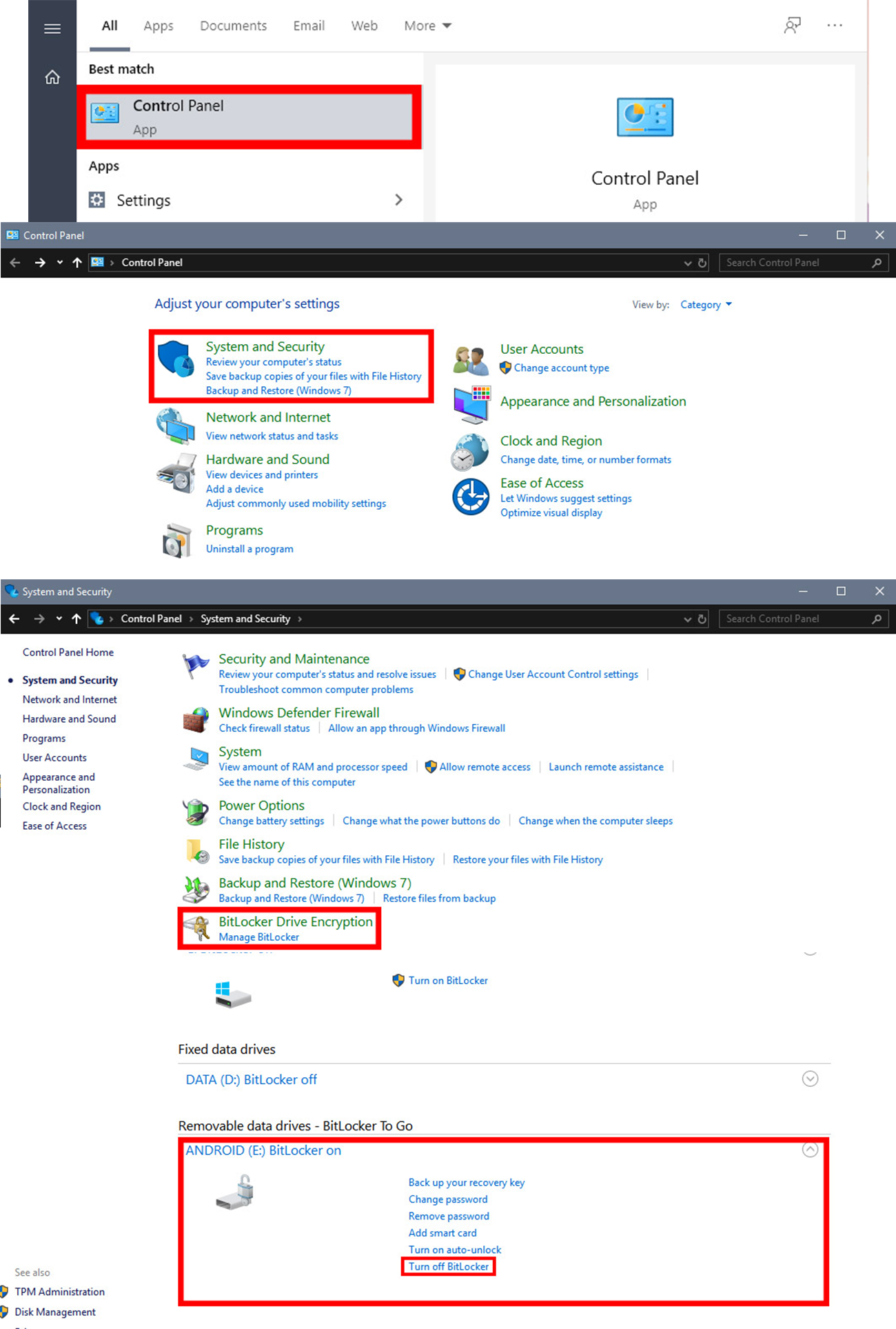 Nếu bạn không muốn sử dụng mật khẩu cho USB nữa thì có thể thực hiện theo các bước sau: Đầu tiên bạn mở tính năng Control panel > Chọn chế độ BitLocker Drive Encryption> Chọn USB đã mã hóa > Cuối cùng chọn chế độ Turn off BitLocker để gỡ mật khẩu.