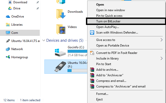Trước tiên, bạn cắm USB vào máy tính chạy Windows 10/8/7. Sau đó, kích chuột phải vào USB > Chọn chế độ Turn on Bitlocker.
