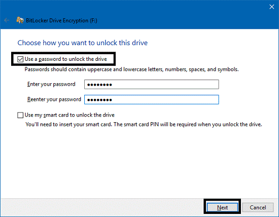 Xuất hiện hộp thoại, bạn tích vào mục Use a password to unlock the drive > Sau đó nhập mật khẩu bạn muốn vào 2 ô dưới > Nhấn chọn Next để tiếp tục.