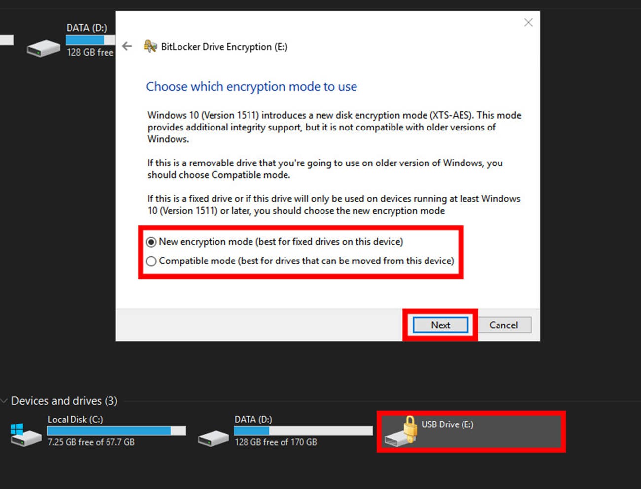 Với Windows 10 từ phiên bản 1511, chúng ta có thêm tùy chọn mã hóa mới là XTS-AES. Nếu máy tính của bạn đang ở Windows 10 phiên bản 1511 trở lên thì có thể chọn chế độ New encryption mode. Và ngược lại, để USB có thể sử dụng ở những phiên bản thấp hơn thì bạn nên chọn chế độ Compatible mode.