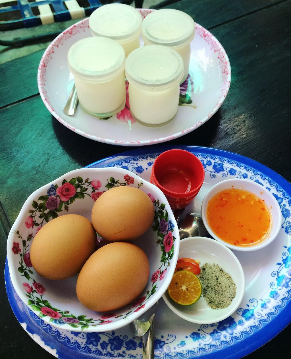 Sự kết hợp giữa món mặn và ngọt trong combo "trứng lòng đào, sữa chua" sẽ thỏa mãn những tín đồ thèm ăn. Sữa chua thanh, ngậy được thưởng thức trong những chiếc hũ nhỏ xinh, có giá 10.000 đồng. Trứng hồng đào sánh, béo được chấm cùng muối tiêu hoặc sốt tắc chua ngọt, đậm vị, giá khoảng 7.000 đồng.