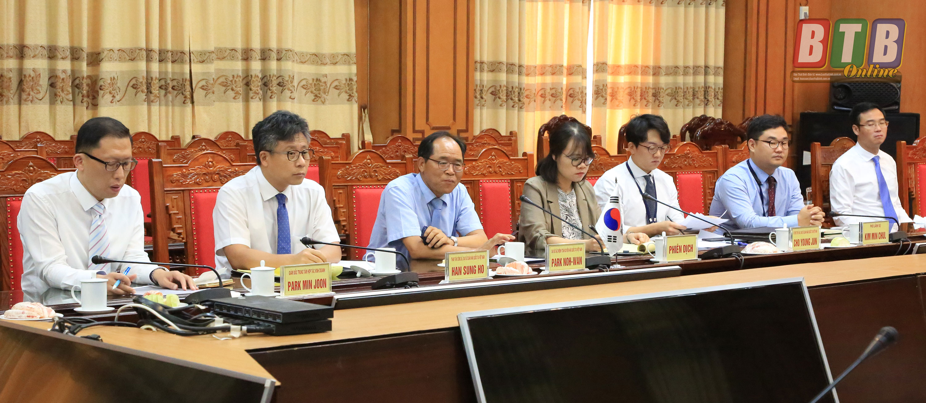 Tại buổi làm việc, đồng chí Bí thư Tỉnh ủy và đồng chí Phó Bí thư Tỉnh ủy, Chủ tịch UBND tỉnh bày tỏ sự vui mừng khi ngài Đại sứ và đoàn công tác của Đại sứ quán Hàn Quốc đến thăm, làm việc và tìm kiếm cơ hội hợp tác đầu tư tại Thái Bình; đồng thời, cảm ơn Hàn Quốc đã có nhiều giải pháp hỗ trợ tỉnh trong việc thúc đẩy phát triển kinh tế - xã hội thời gian qua.