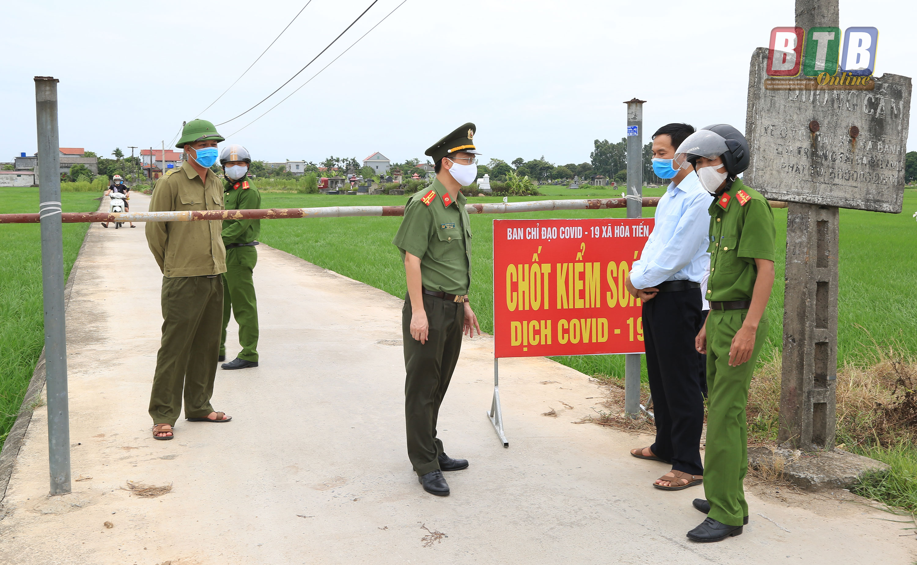 Chốt kiểm dịch tại thôn Bùi, xã Hòa Tiến, huyện Hưng Hà được thiết lập lúc 12 giờ trưa ngày 01/8. Ảnh: Thành Tâm