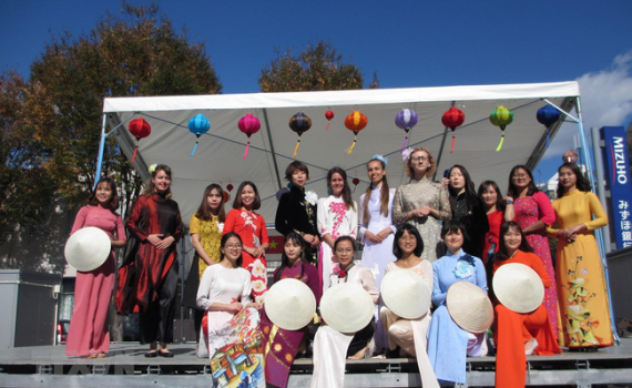 Du học sinh Việt Nam và nước ngoài ở Fukushima trong màn trình diễn áo dài tại Lễ hội Việt Nam 2019.