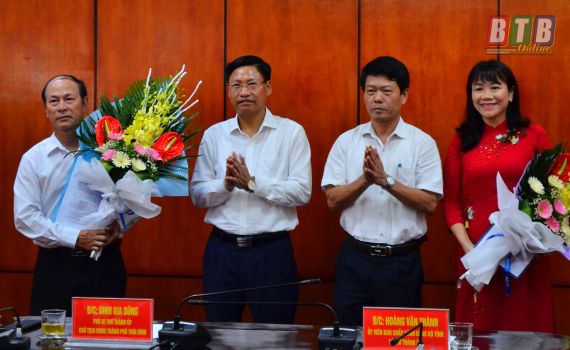 Các đồng chí lãnh đạo thành phố tặng hoa chúc mừng.