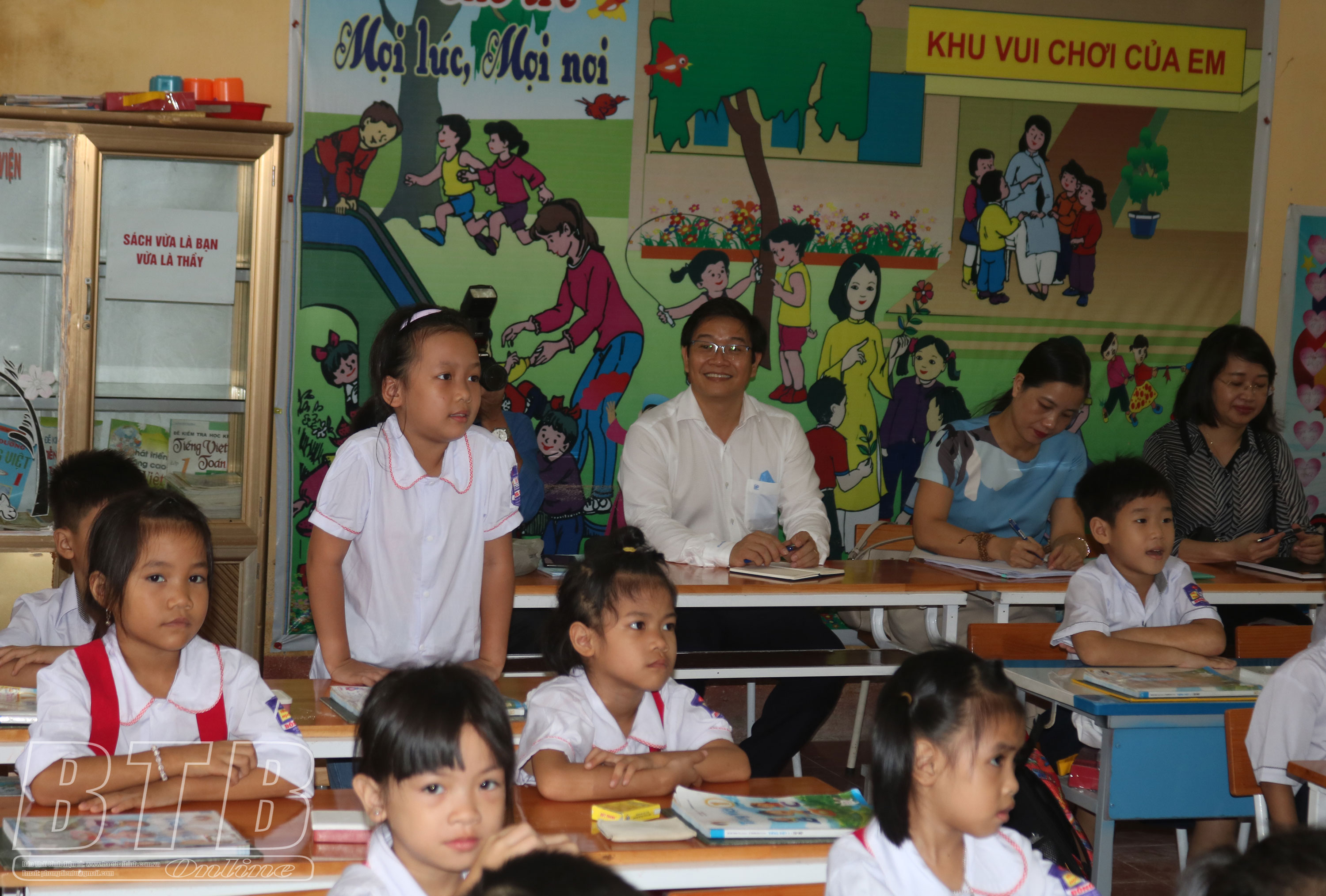 Đồng chí Thái Văn Tài, Vụ trưởng Vụ Giáo dục Tiểu học, Bộ Giáo dục và Đào tạo dự giờ tiết học Tiếng Việt tại Trường Tiểu học Đông La (Đông Hưng).