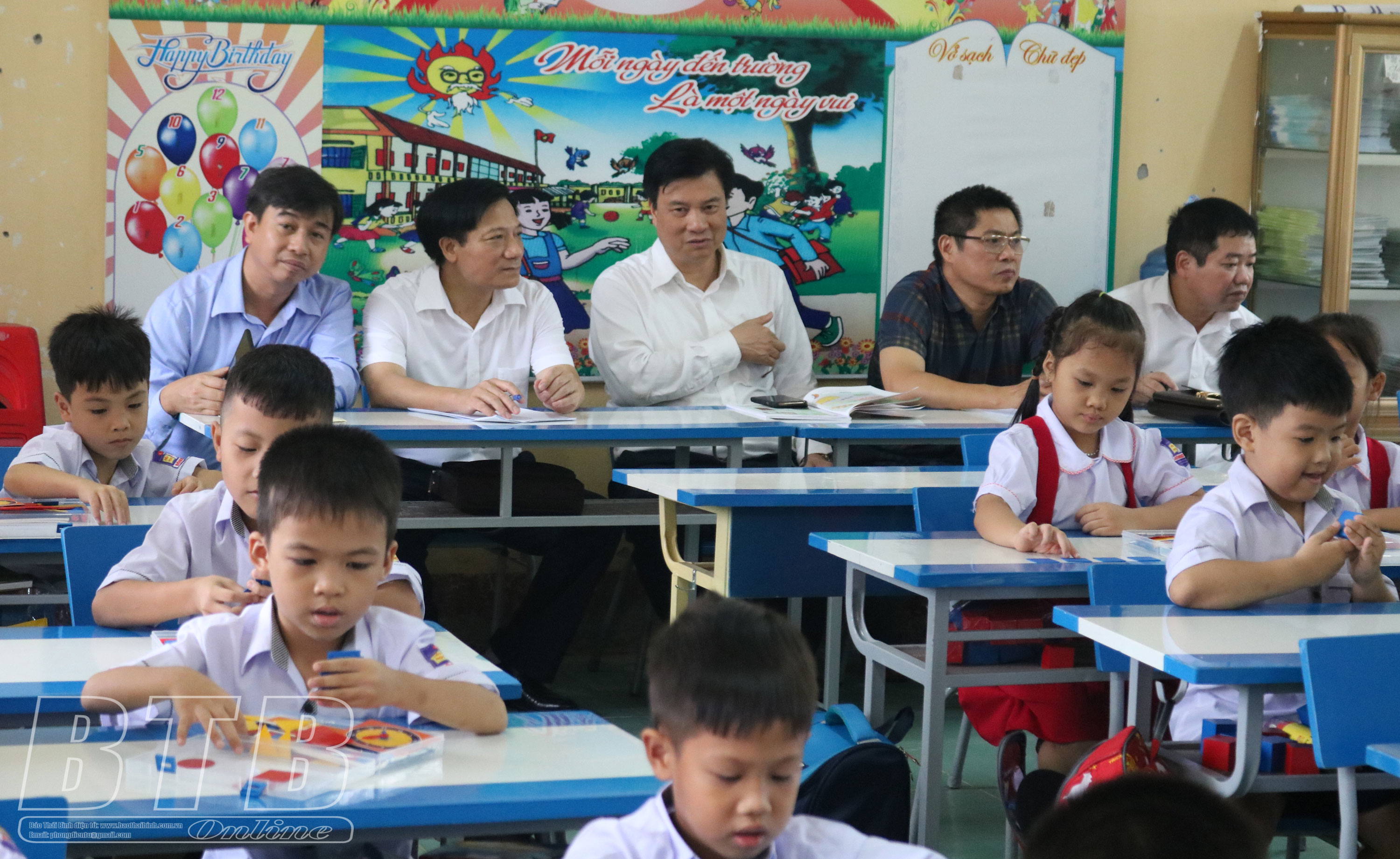 Thứ trưởng Bộ Giáo dục và Đào tạo Nguyễn Hữu Độ (ngồi giữa) dự giờ tiết Toán tại Trường Tiểu học Đông La (Đông Hưng).