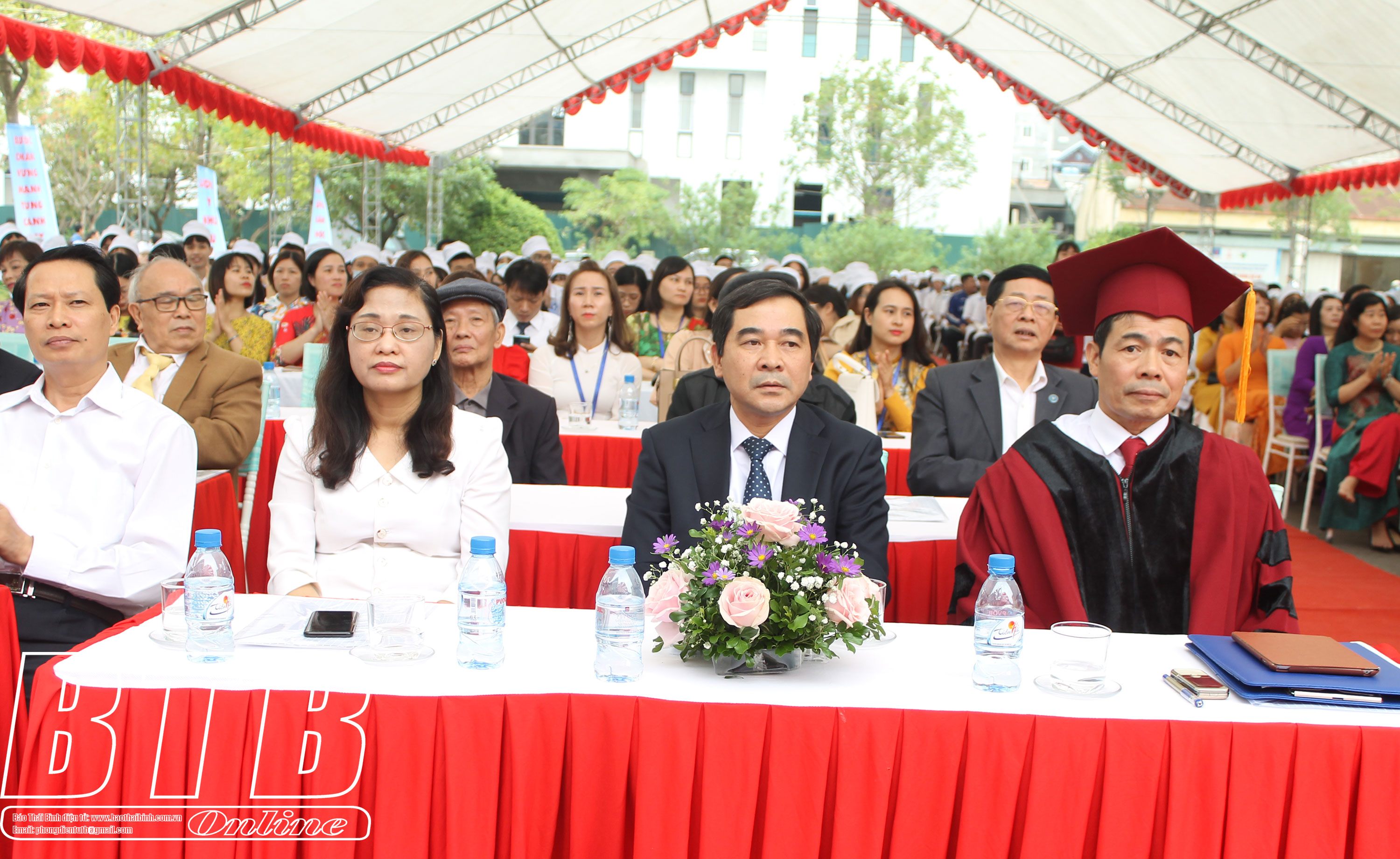 Các đồng chí lãnh đạo Tỉnh ủy, UBND tỉnh và các đại biểu dự lễ khai giảng năm học mới 2020 - 2021 tại Trường Đại học Y Dược Thái Bình.