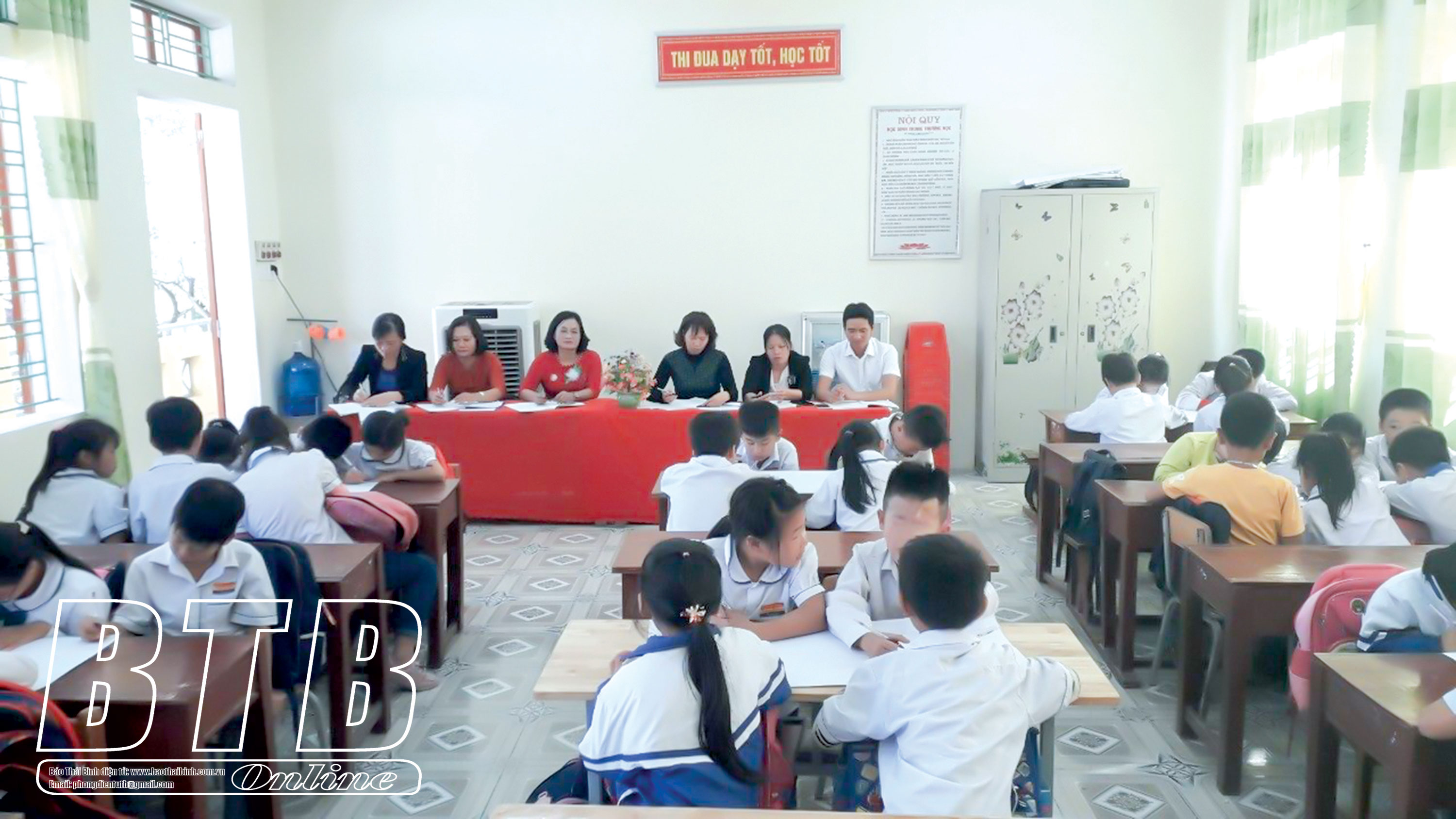 Các thầy cô giáo Trường Tiểu học và THCS Trần Đức Thông (Hưng Hà) dự giờ tiết hội giảng.