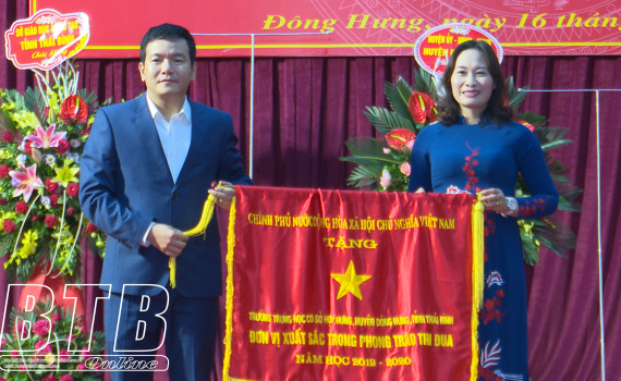 Lãnh đạo Huyện ủy Đông Hưng trao Cờ thi đua của Chính phủ cho Trường THCS Hợp Hưng.
