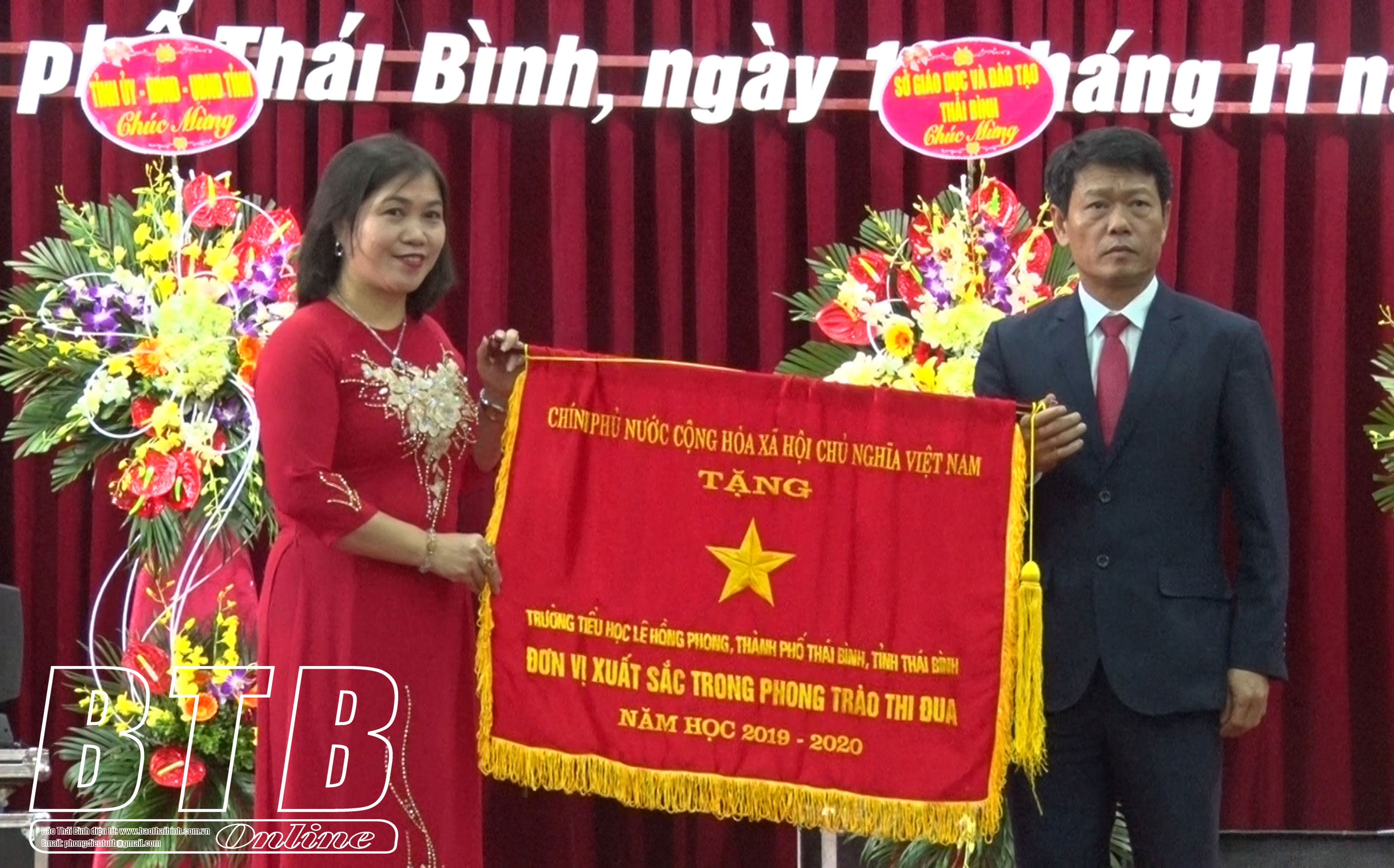Đồng chí Hoàng Văn Thành, Ủy viên Ban Thường vụ Tỉnh ủy, Bí thư Thành ủy trao cờ thi đua của Chính phủ cho Trường Tiểu học Lê Hồng Phong.