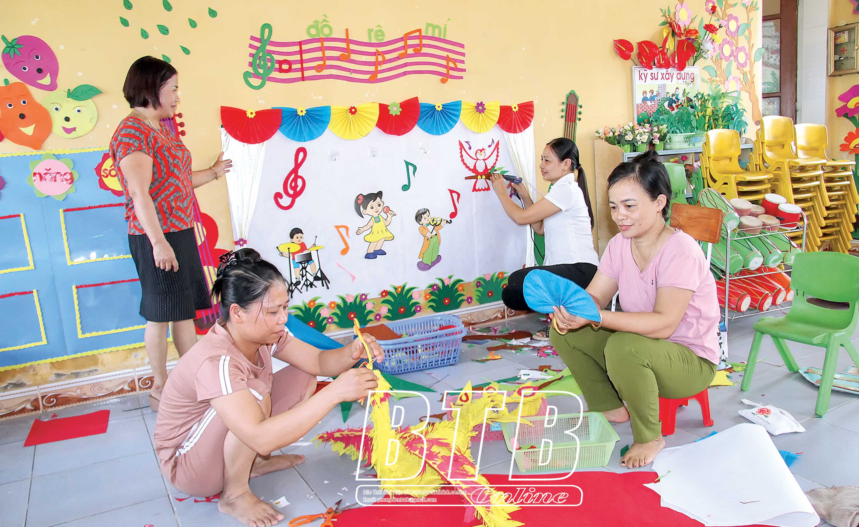 Các cô giáo Trường Mầm non Thăng Long (Đông Hưng) tự làm đồ dùng, đồ chơi để trang trí lớp và tạo góc học tập.