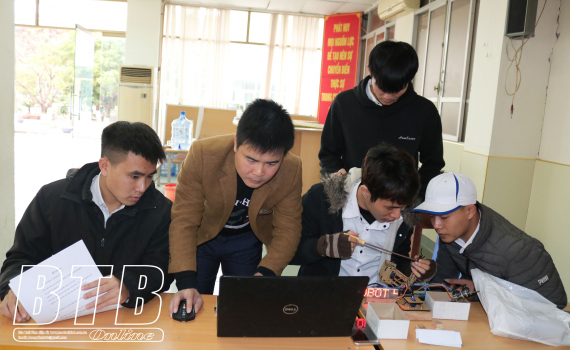 Nhóm tác giả chuẩn bị công trình nghiên cứu trước hội thi.