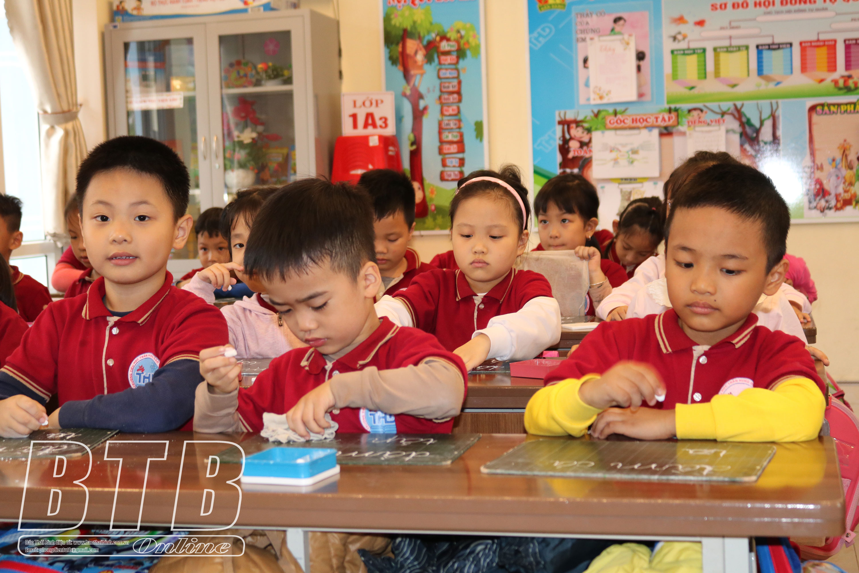 Học sinh lớp 1 Trường Tiểu học Trần Hưng Đạo (thành phố Thái Bình) với tiết học trên lớp.