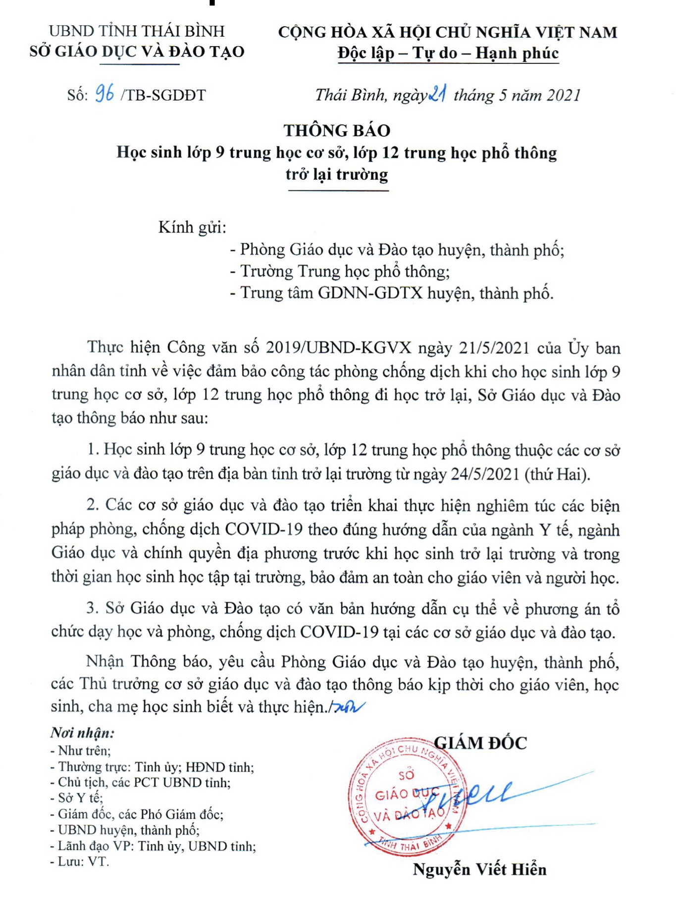 Thông báo số 96/TB-SGDDT, ngày 21/5/2021của Sở Giáo dục và Đào tạo Thái Bình.
