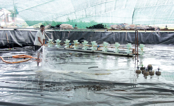 Người dân xã Nam Phú (Tiền Hải) áp dụng khoa học xử lý môi trường ao nuôi tôm.