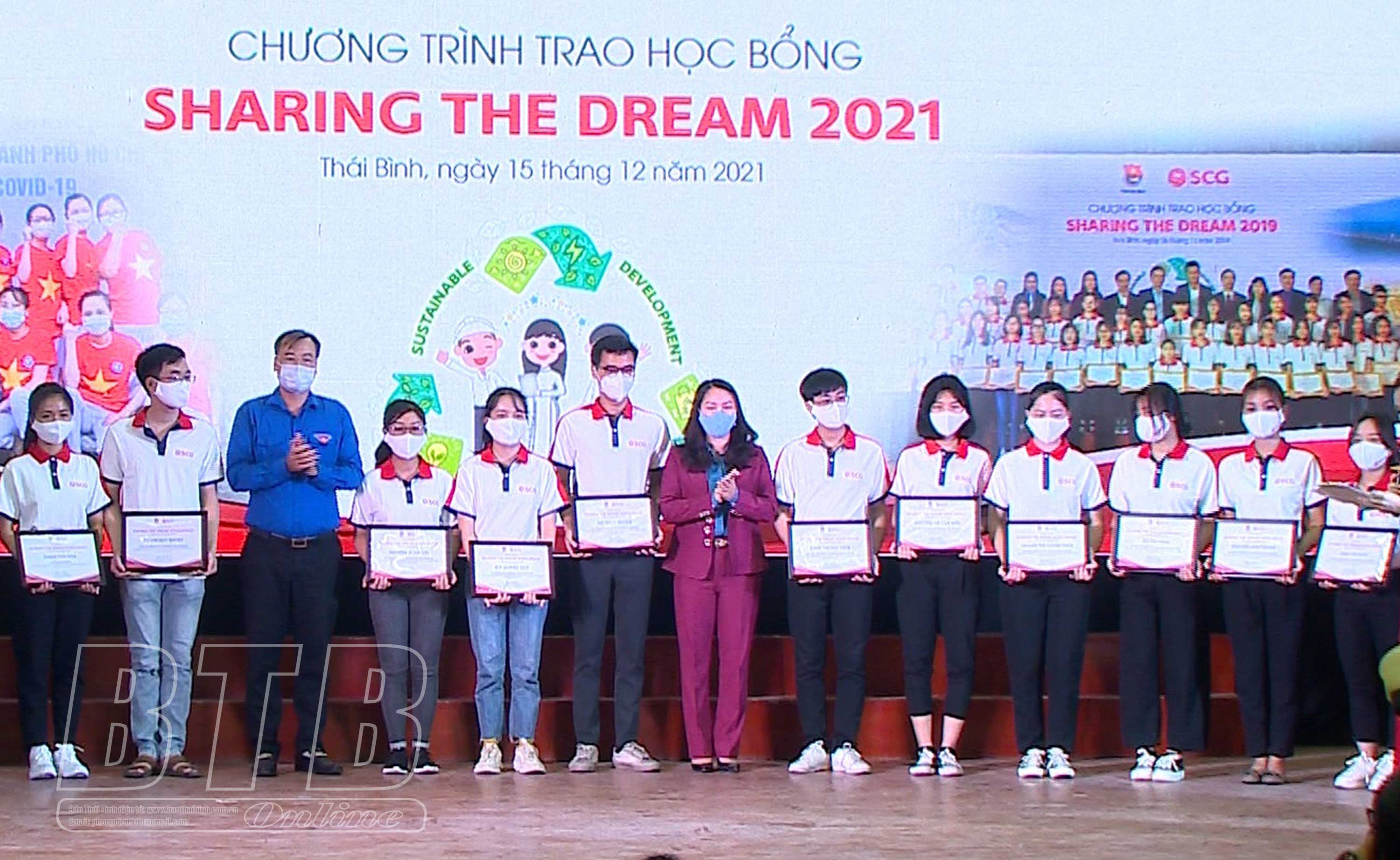 Em Phan Thị Nhung, sinh viên năm thứ nhất Khoa Giáo dục mầm non, Trường Cao đẳng Sư phạm Thái Bình (ngoài cùng bên phải) và các em học sinh, sinh viên nhận học bổng Sharing the Dream 2021.
