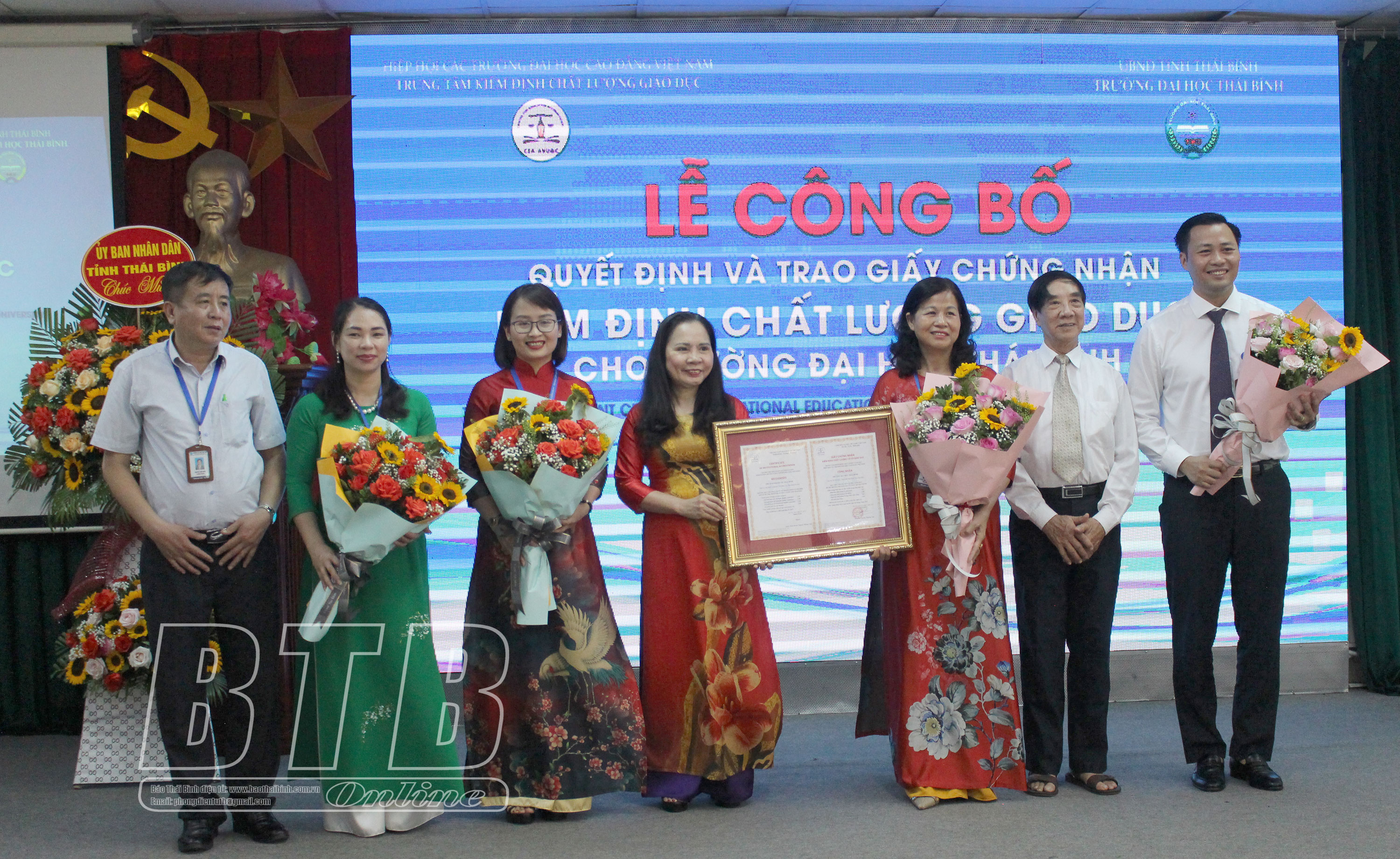Lãnh đạo Trung tâm Kiểm định chất lượng giáo dục trao giấy chứng nhận kiểm định chất lượng cơ sở giáo dục đại học cho Trường Đại học Thái Bình.