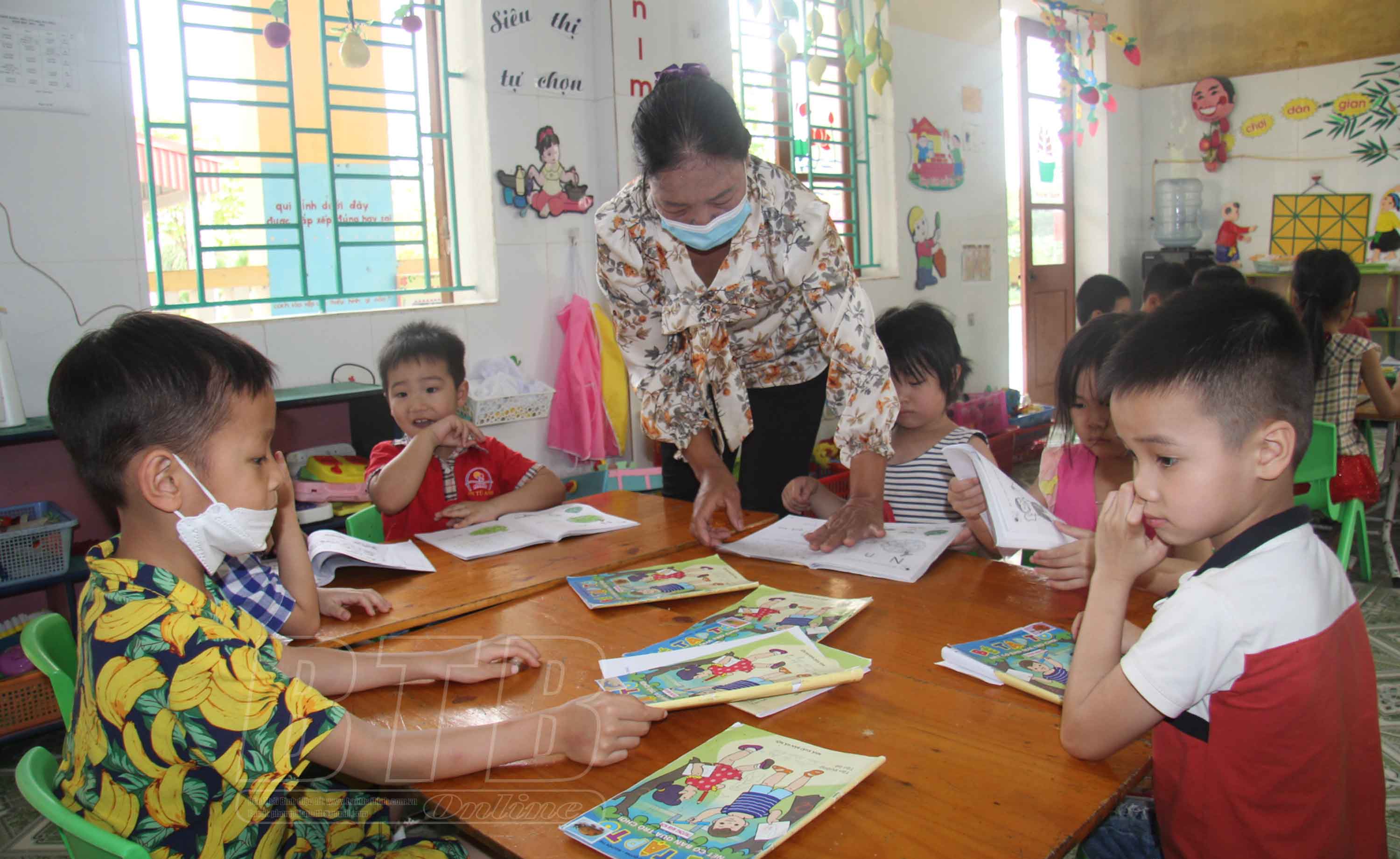 Các em học sinh khối 5 tuổi Trường Mầm non Điệp Nông (Hưng Hà) được các cô giáo hướng dẫn tỉ mỉ các bài học.