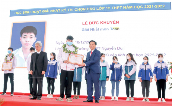 Với 29,8 điểm, em Lê Đức Khuyến, học sinh lớp 12A12, Trường THPT Nguyễn Du trở thành á khoa khối A cả nước và là thủ khoa của tỉnh. Điểm thành phần từng môn tổ hợp Toán, Vật lý, Hóa học của em lần lượt là 9,8 - 10 - 10. Kết quả này không khiến các thầy cô giáo trong trường bất ngờ vì từ trước đến nay, thành tích học của cậu học trò vẫn luôn rất tốt và là học sinh tiêu biểu của trường.