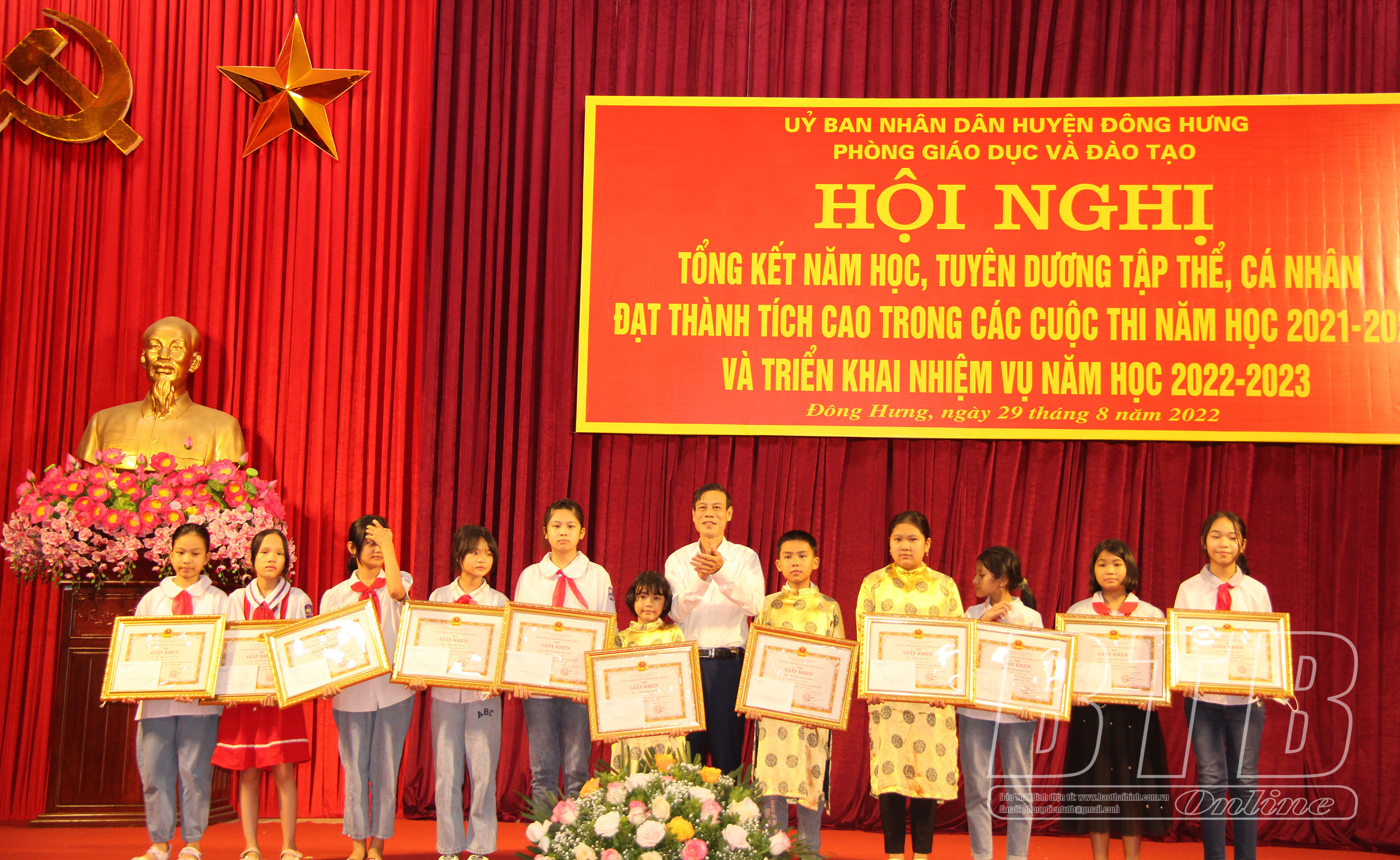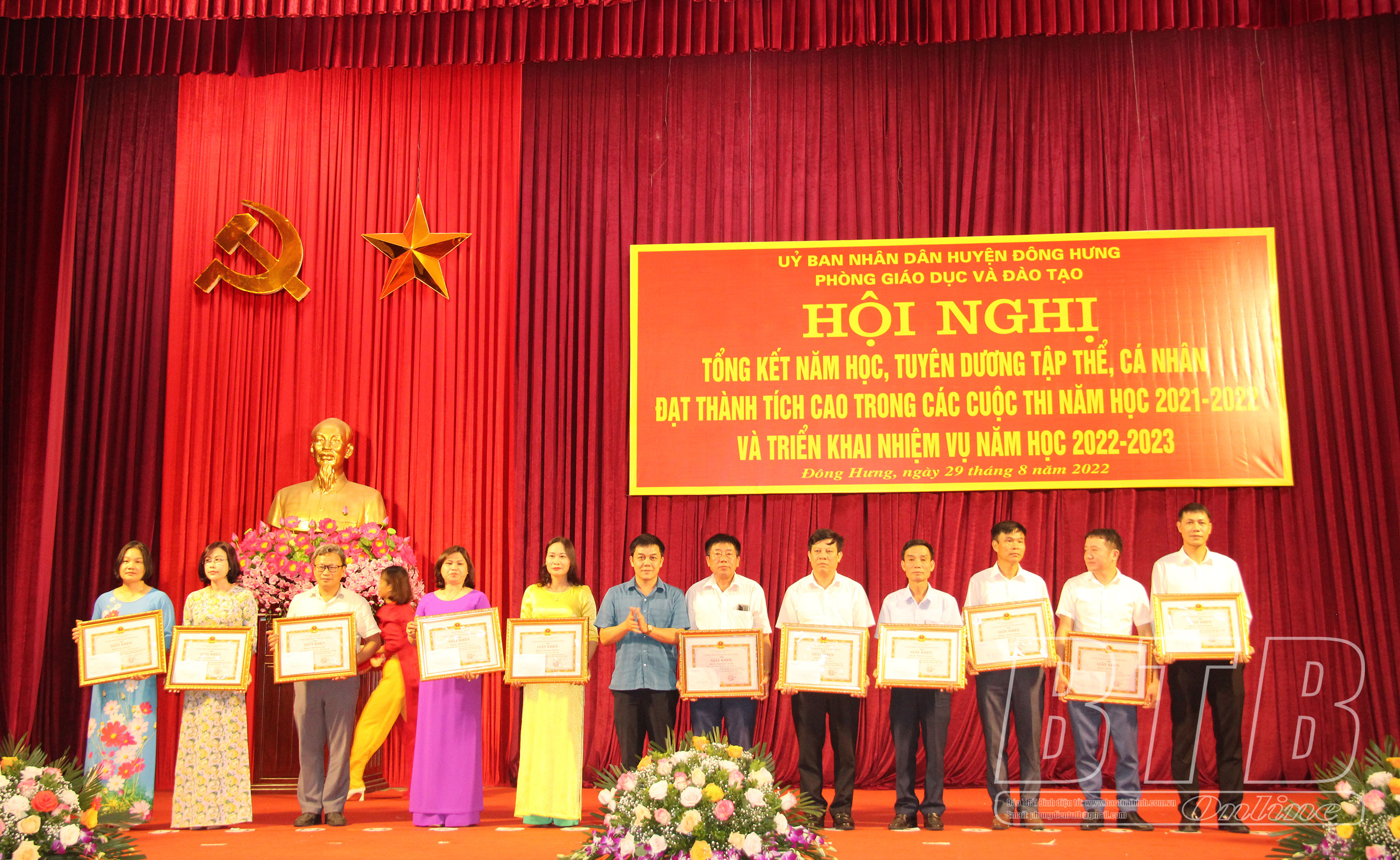 Tại hội nghị, UBND huyện Đông Hưng đã tuyên dương, khen thưởng 306 tập thể, cá nhân đạt thành tích cao trong các cuộc thi năm học 2021 - 2022.