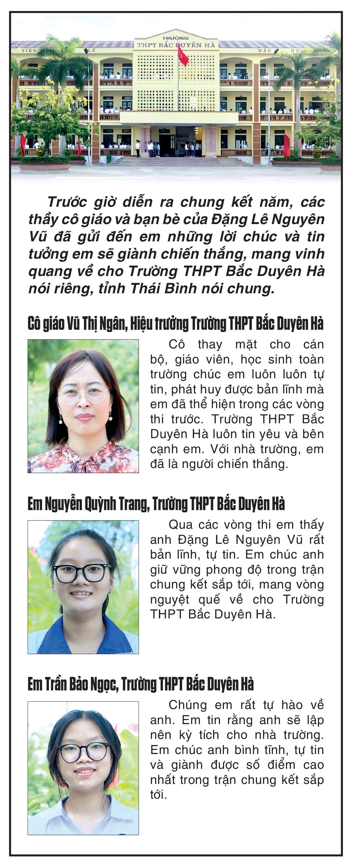Cô giáo Vũ Thị Ngân, Hiệu trưởng Trường THPT Bắc Duyên Hà chia sẻ: Đây là một sự kiện có quy mô lớn, cũng là động lực tiếp sức cho học sinh nhà trường phấn đấu học tập, thêm yêu mái trường. Về công tác tuyên truyền, nhà trường thường xuyên chia sẻ trên các nền tảng xã hội các thông tin về chương trình và hành trình em Đặng Lê Nguyên Vũ đã trải qua để bước vào chung kết. Bên cạnh đó, nhà trường cũng tổ chức các hoạt động để động viên em Đặng Lê Nguyên Vũ. Đến thời điểm này, Trường THPT Bắc Duyên Hà đã hoàn tất công tác chuẩn bị, sẵn sàng góp phần để chương trình tổ chức thành công.