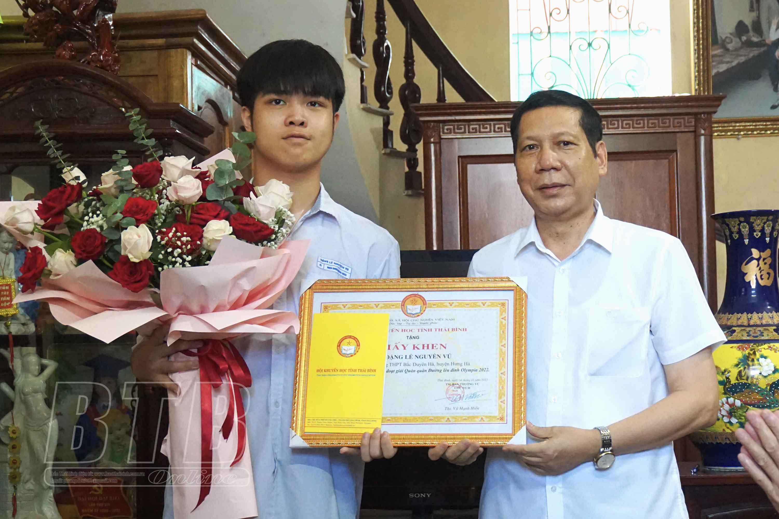 Đại diện Hội Khuyến học tỉnh, Ban Văn hóa Xã hội, HĐND tỉnh và Ngân hàng Agribank chi nhánh Thái Bình tới thăm, chúc mừng em Đặng Lê Nguyên Vũ.