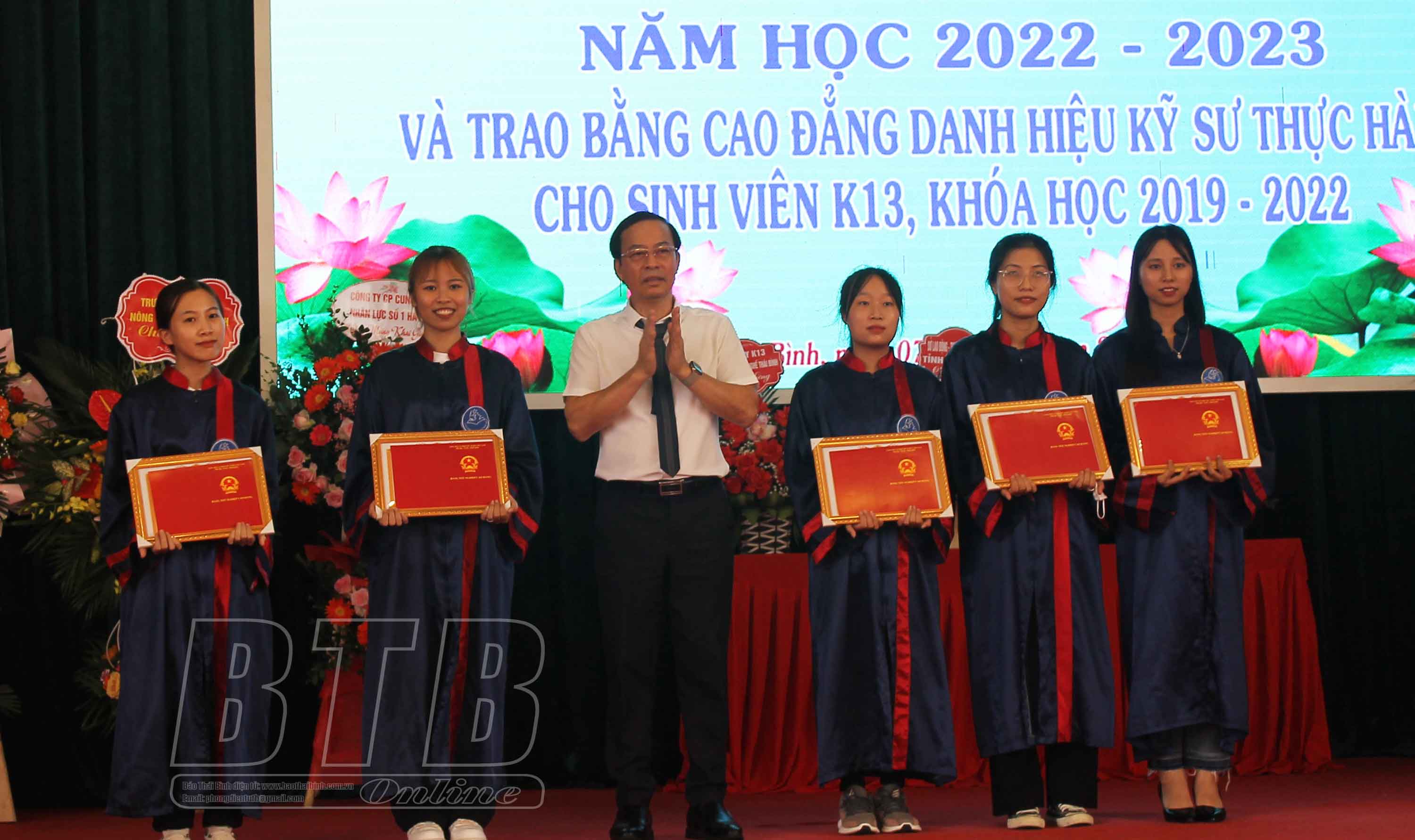 Lãnh đạo Trường Cao đẳng Nghề Thái Bình trao bằng tốt nghiệp và giấy khen cho 5 sinh viên khóa XIII đạt thành tích xuất sắc nhất.