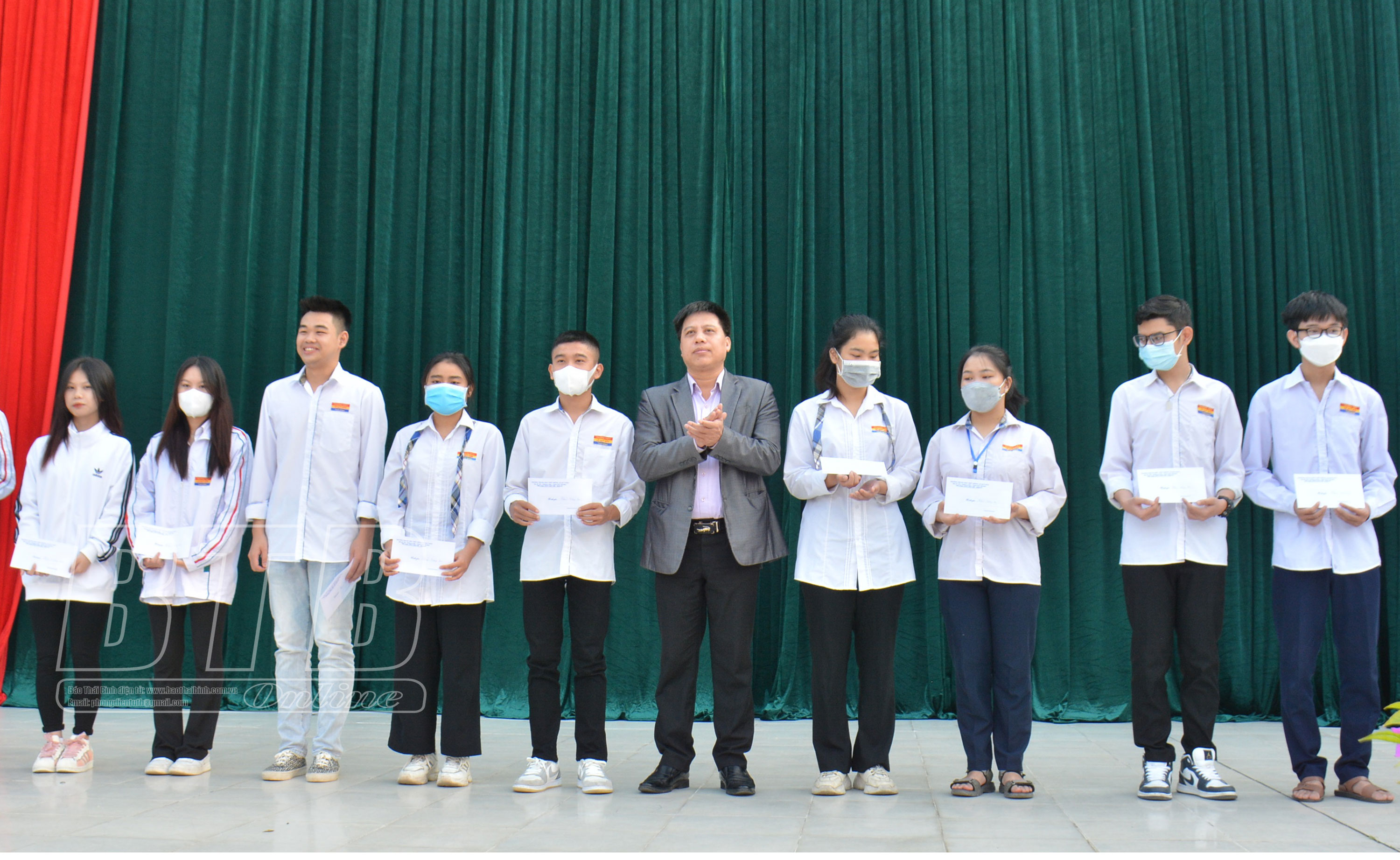Các em học sinh tham gia đội tuyển học sinh giỏi khối 12 có hoàn cảnh khó khăn nhận quà của Đoàn Trường.