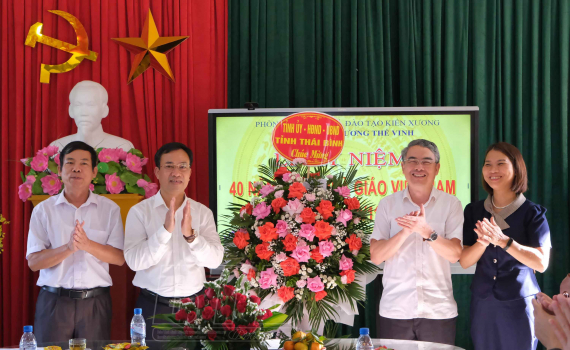 Nhân dịp này, đồng chí tặng hoa và gửi lời chúc mừng tốt đẹp nhất đến tập thể cán bộ, giáo viên, các thế hệ nhà giáo của nhà trường. Đồng chí mong muốn trong thời gian tới nhà trường tích cực đổi mới nội dung, phương pháp giáo dục, cụ thể hóa những nghị quyết của Đảng về đổi mới căn bản, toàn diện giáo dục thành những chương trình, kế hoạch phù hợp nâng cao chất lượng giảng dạy. Cán bộ, giáo viên tiếp tục ra sức thi đua dạy tốt, truyền lửa cho em học sinh thi đua rèn luyện, phát triển toàn diện cả về đạo đức và tri thức. Đồng chí cũng đề nghị các cấp ủy, chính quyền địa phương tiếp tục quan tâm, tạo mọi điều kiện tốt nhất cho Trường THCS Lương Thế Vinh nâng cao chất lượng giáo dục trong những năm học tiếp theo.
